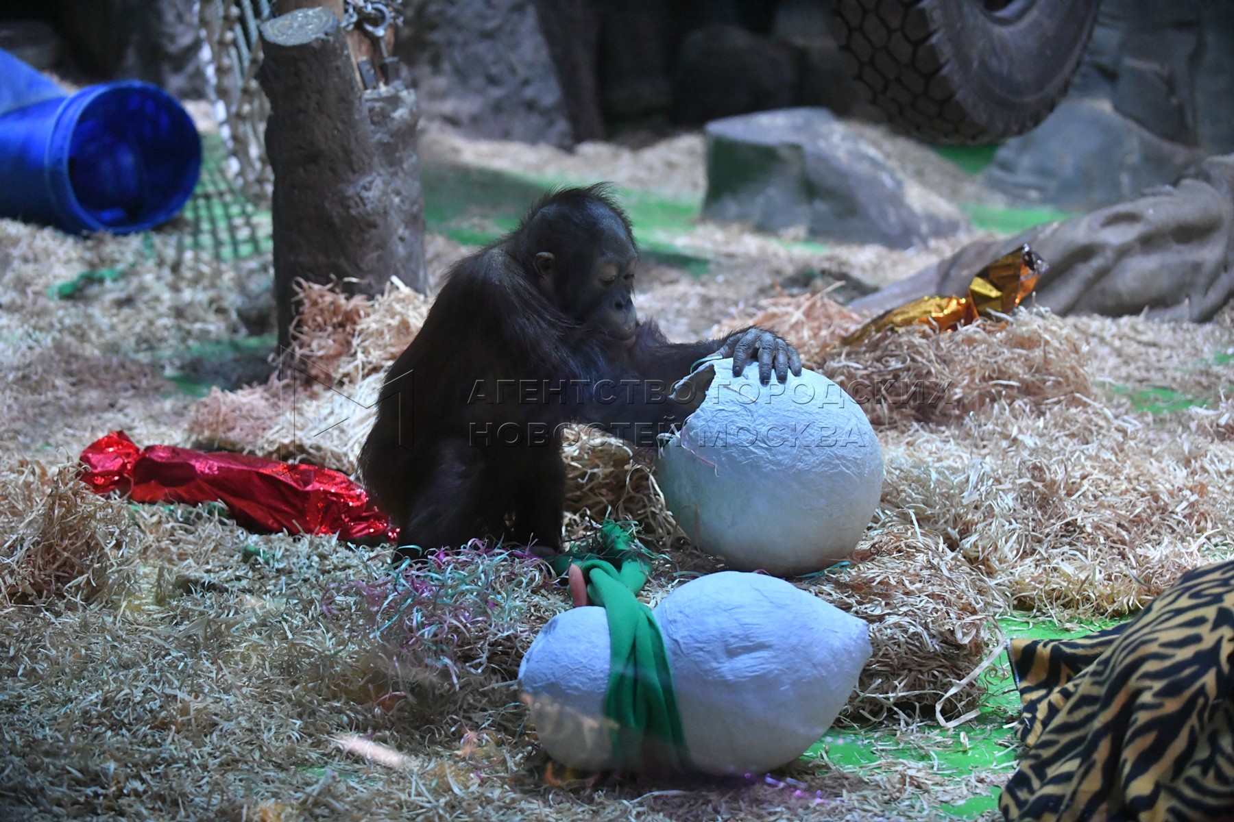 • Описание: Поздравление орангутанов с Новым годом и вручение им подарков с тигриным принтом в Московском зоопарке.