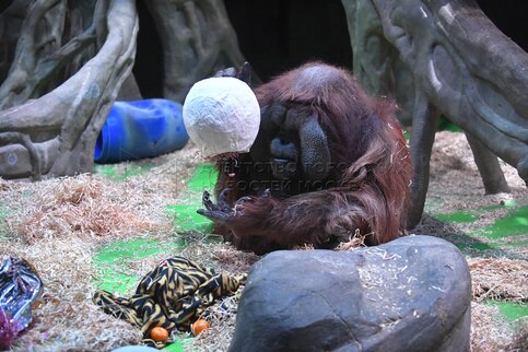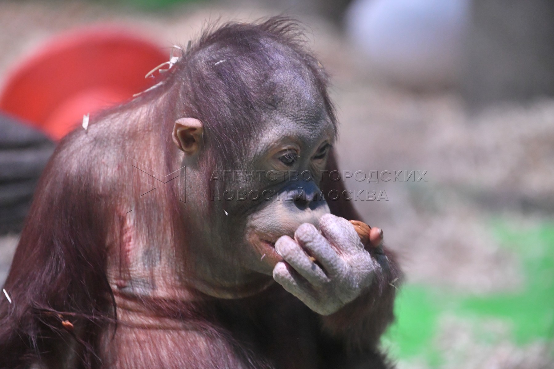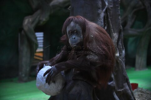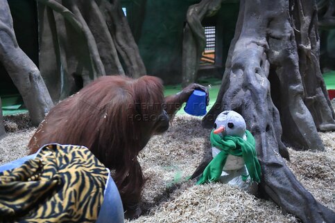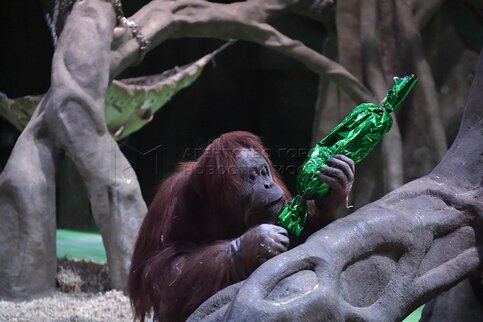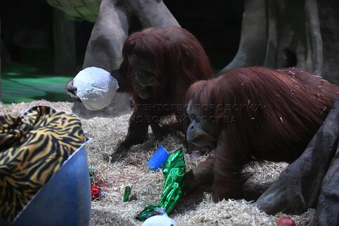 • Описание: Поздравление орангутанов с Новым годом и вручение им подарков с тигриным принтом в Московском зоопарке.