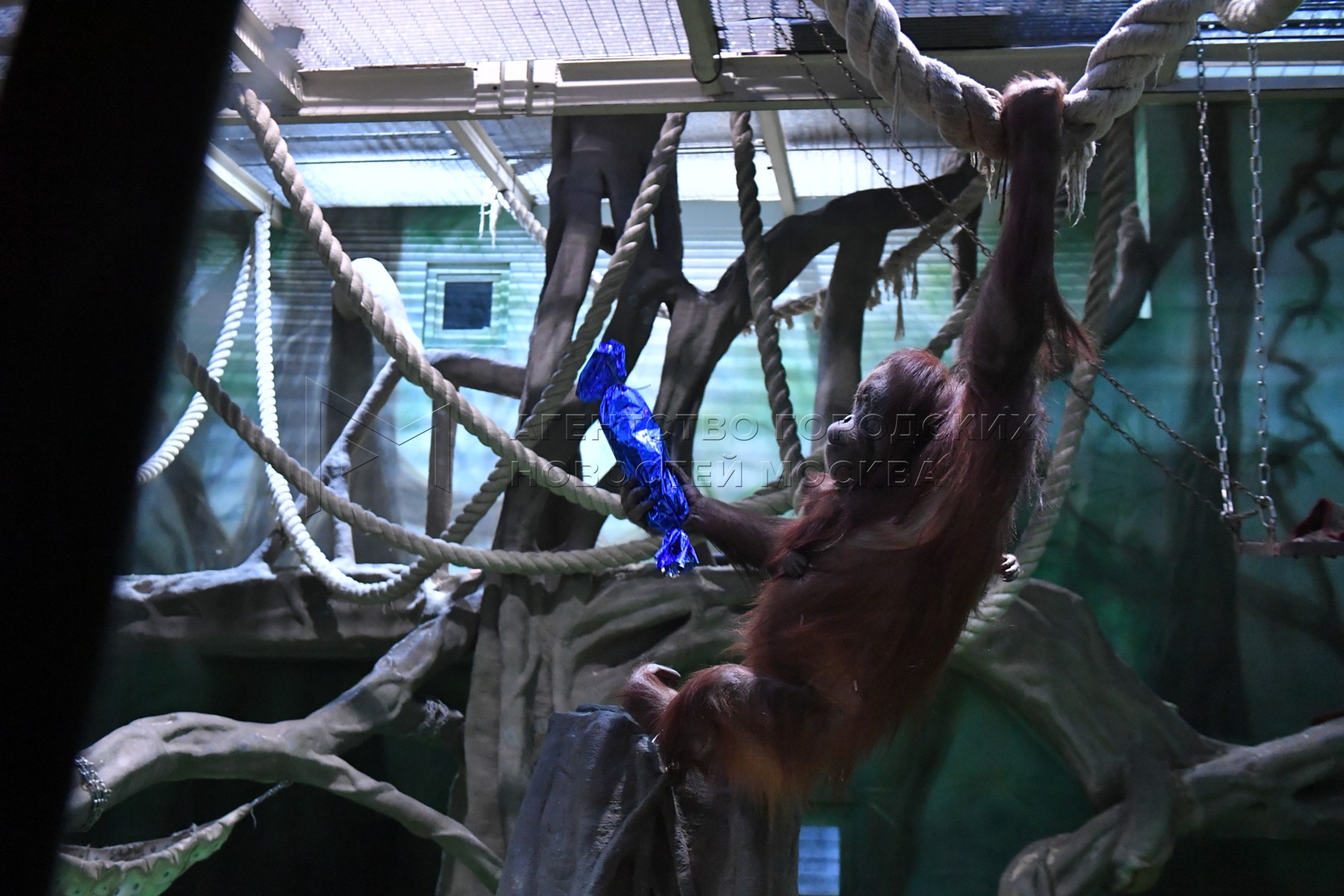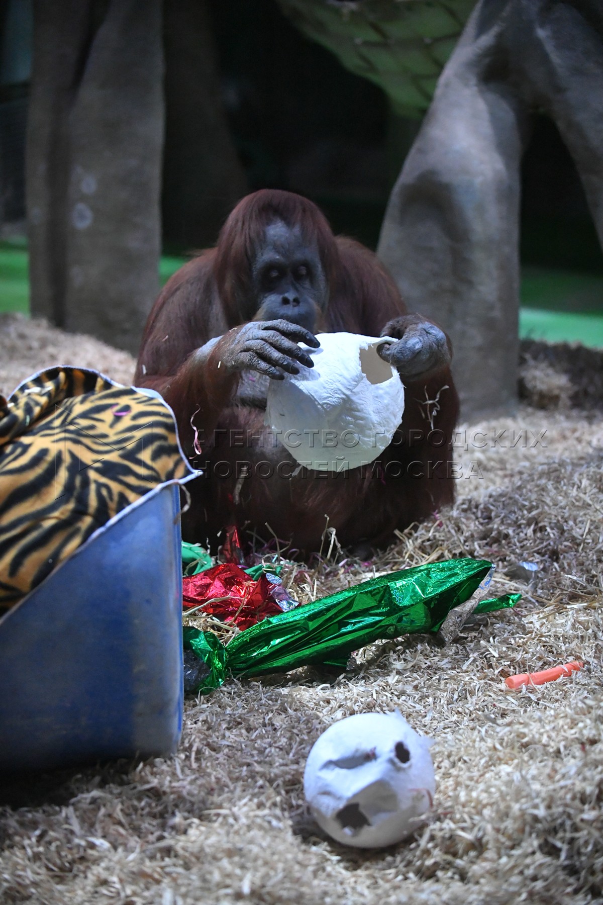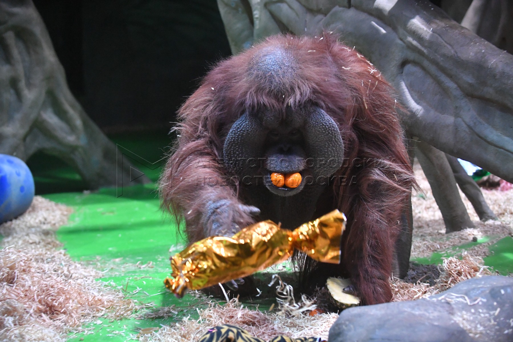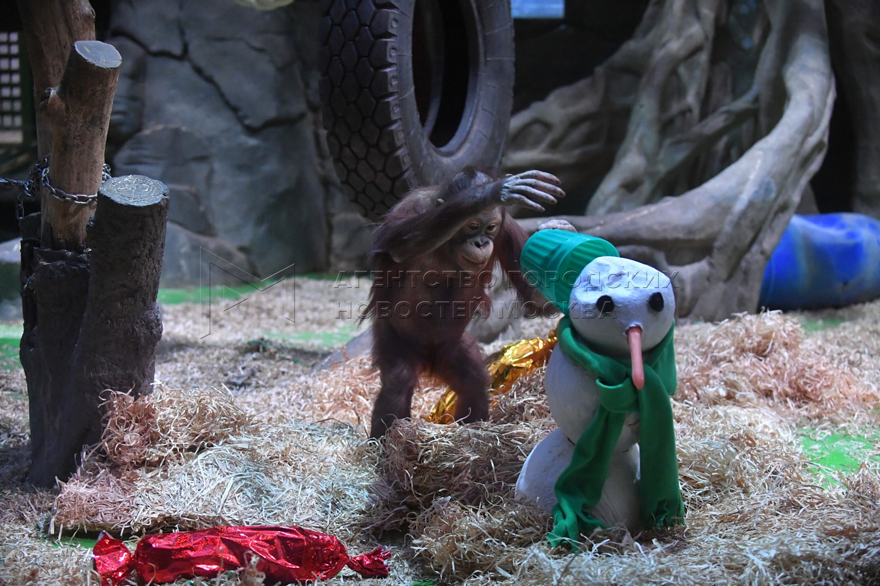 Поздравление орангутанов с Новым годом и вручение им подарков с тигриным принтом в Московском зоопарке.