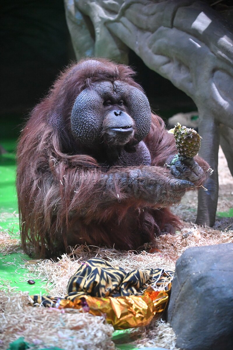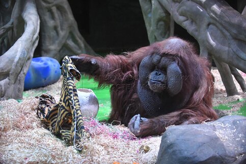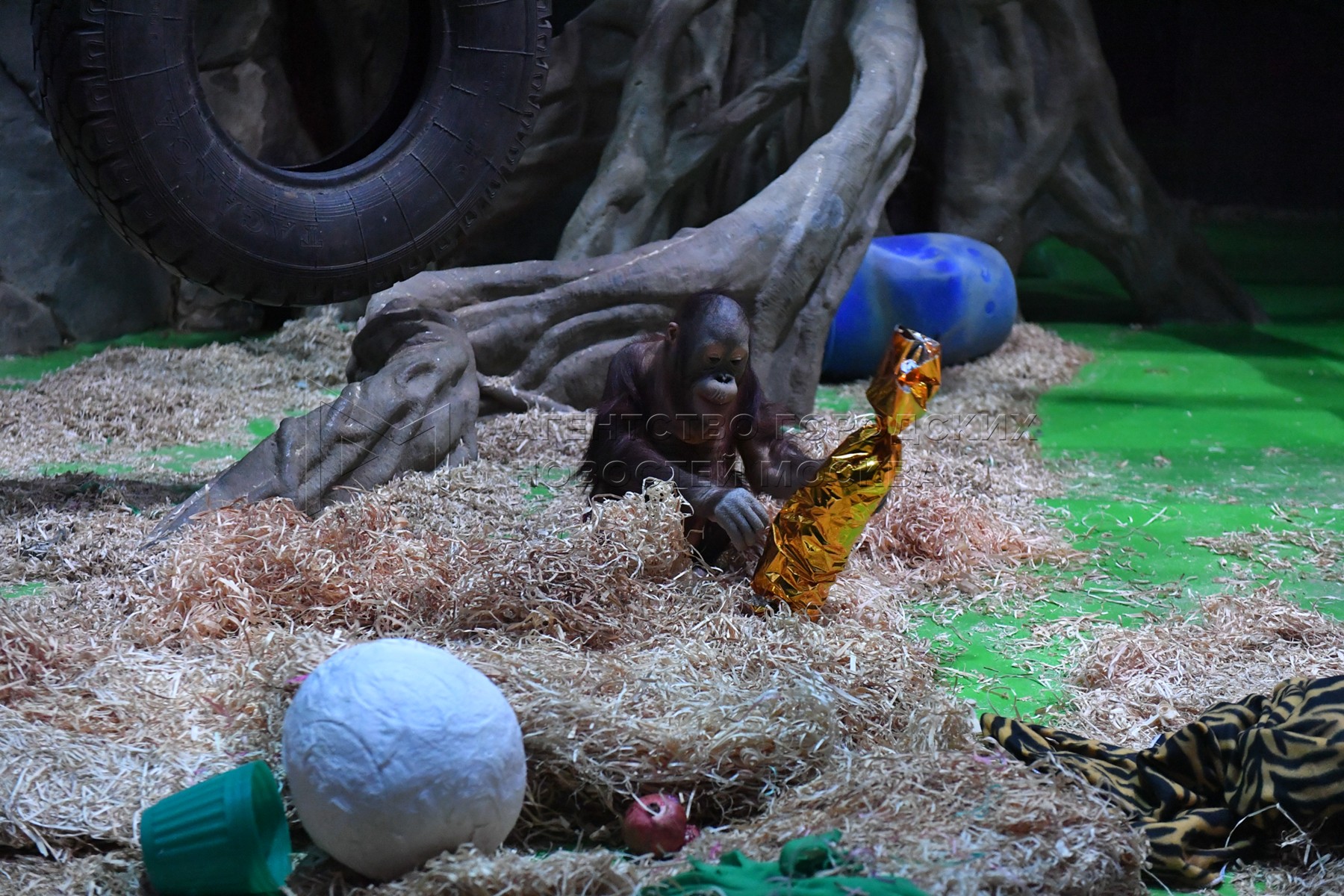 • Заголовок: Поздравление орангутанов с Новым годом и вручение им подарков с тигриным принтом