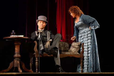 Актеры Валерия Забегаева в роли Глафиры Глумовой и Виктор Запорожский в роли Нила Мамаева во время показа премьерного спектакля «На всякого мудреца довольно простоты» в Театре имени Маяковского.