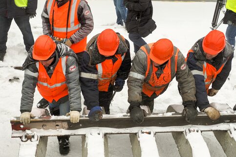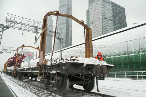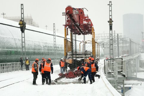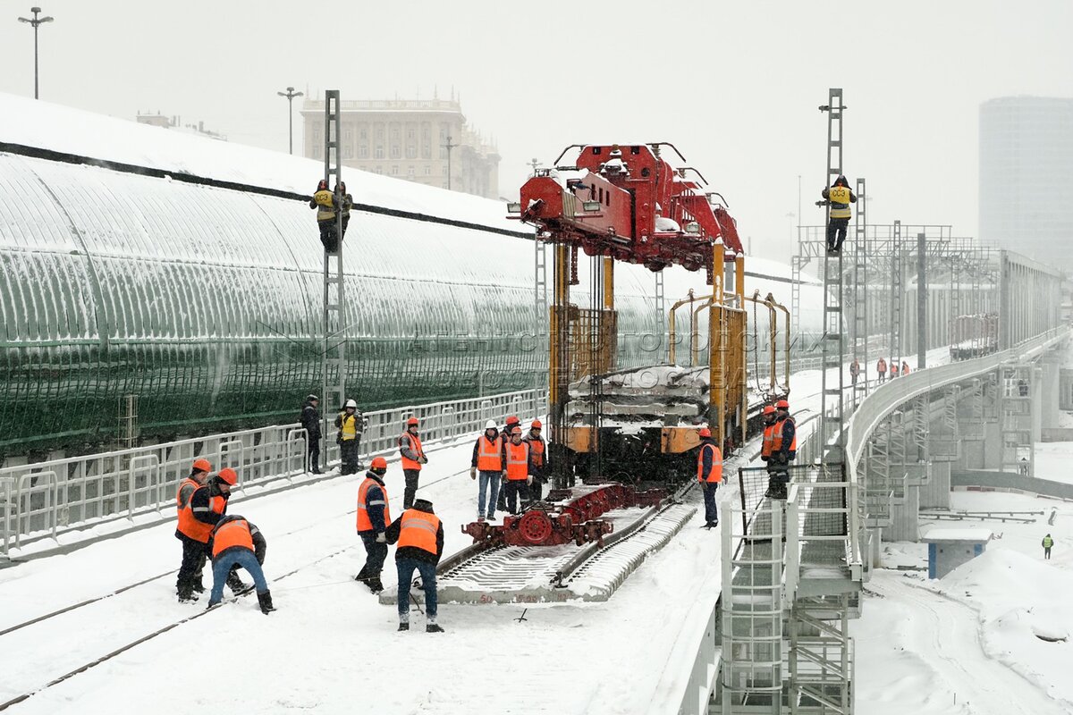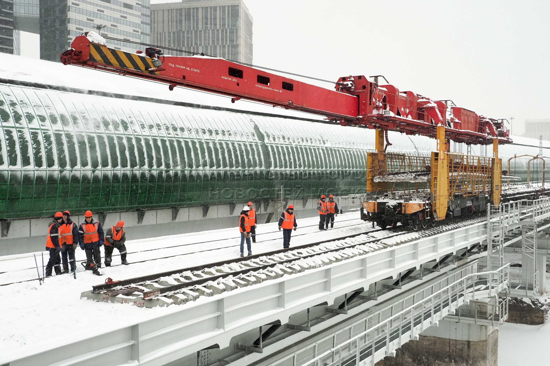 • Описание: Укладка путей на эстакаде соединительной ветки четвертого маршрута Московских центральных диаметров (МЦД-4) в столице.