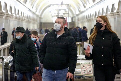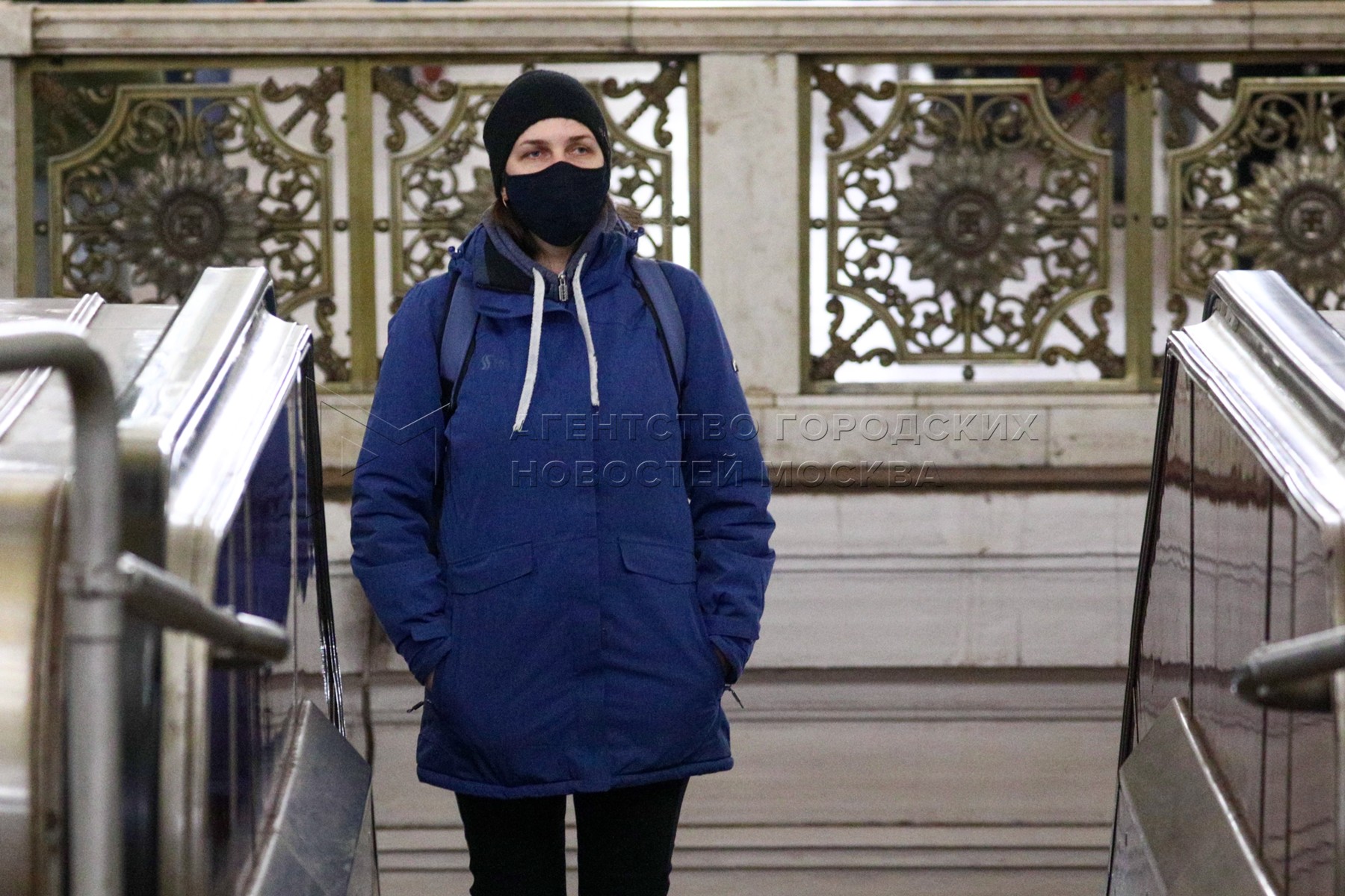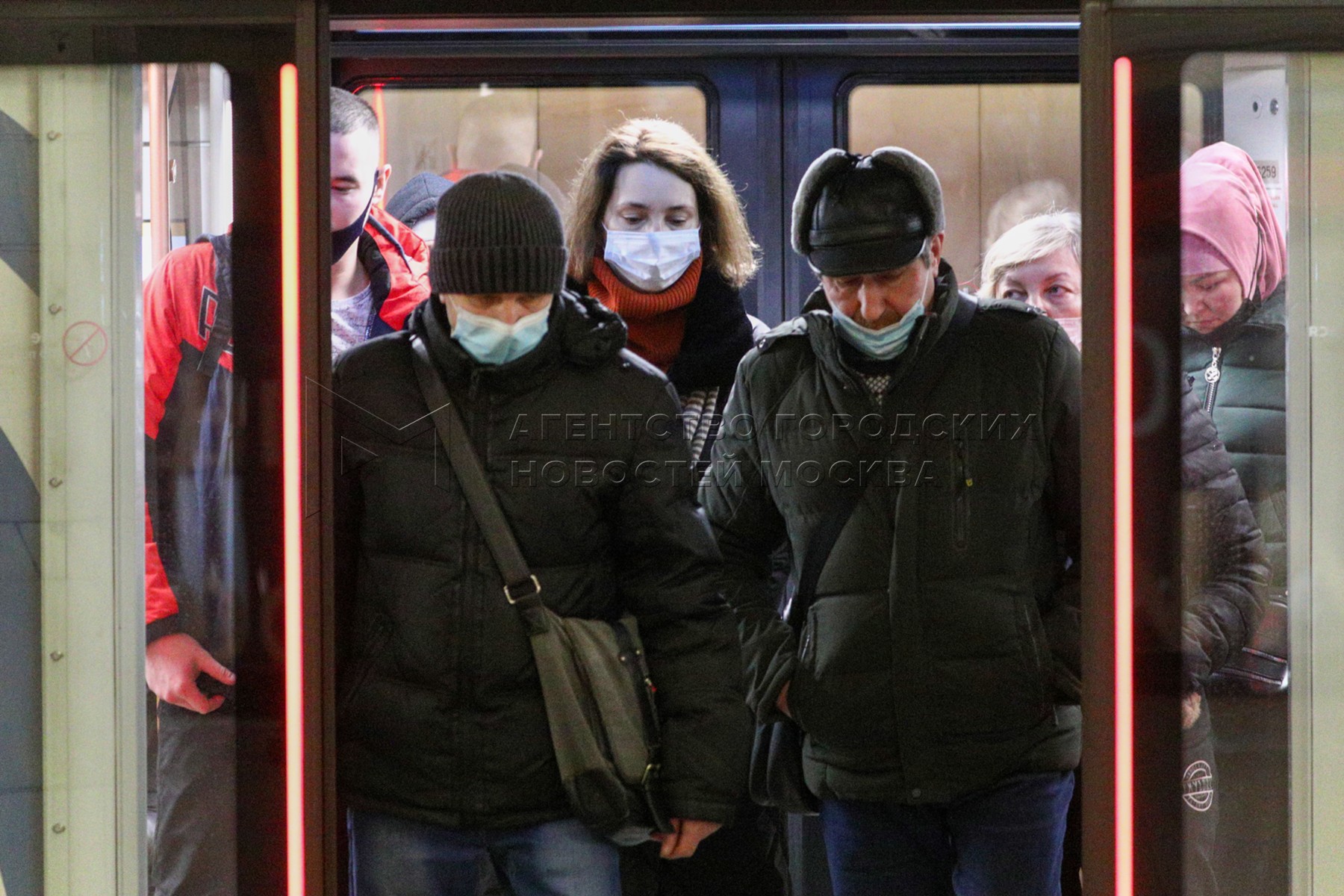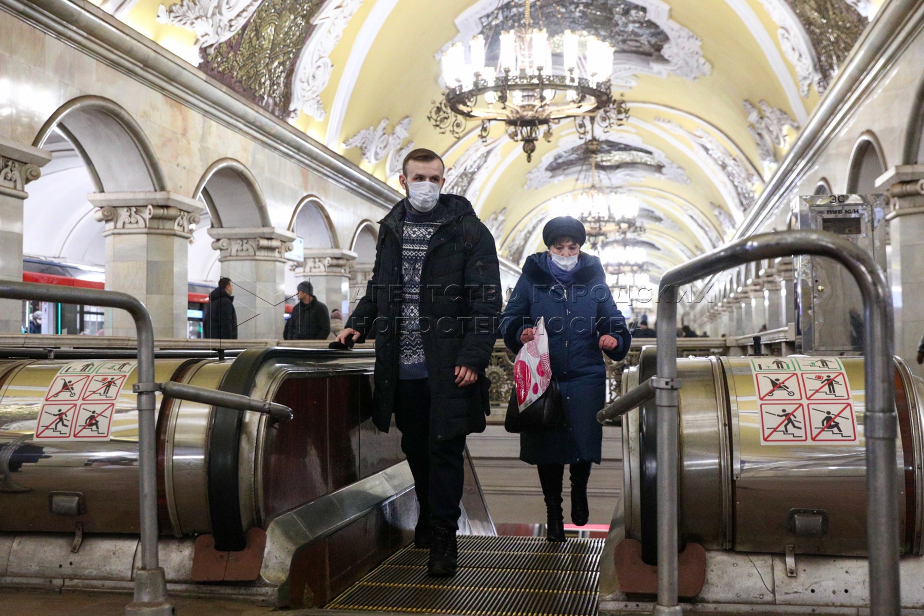 Соблюдение масочного режима пассажирами в Московском метрополитене.
