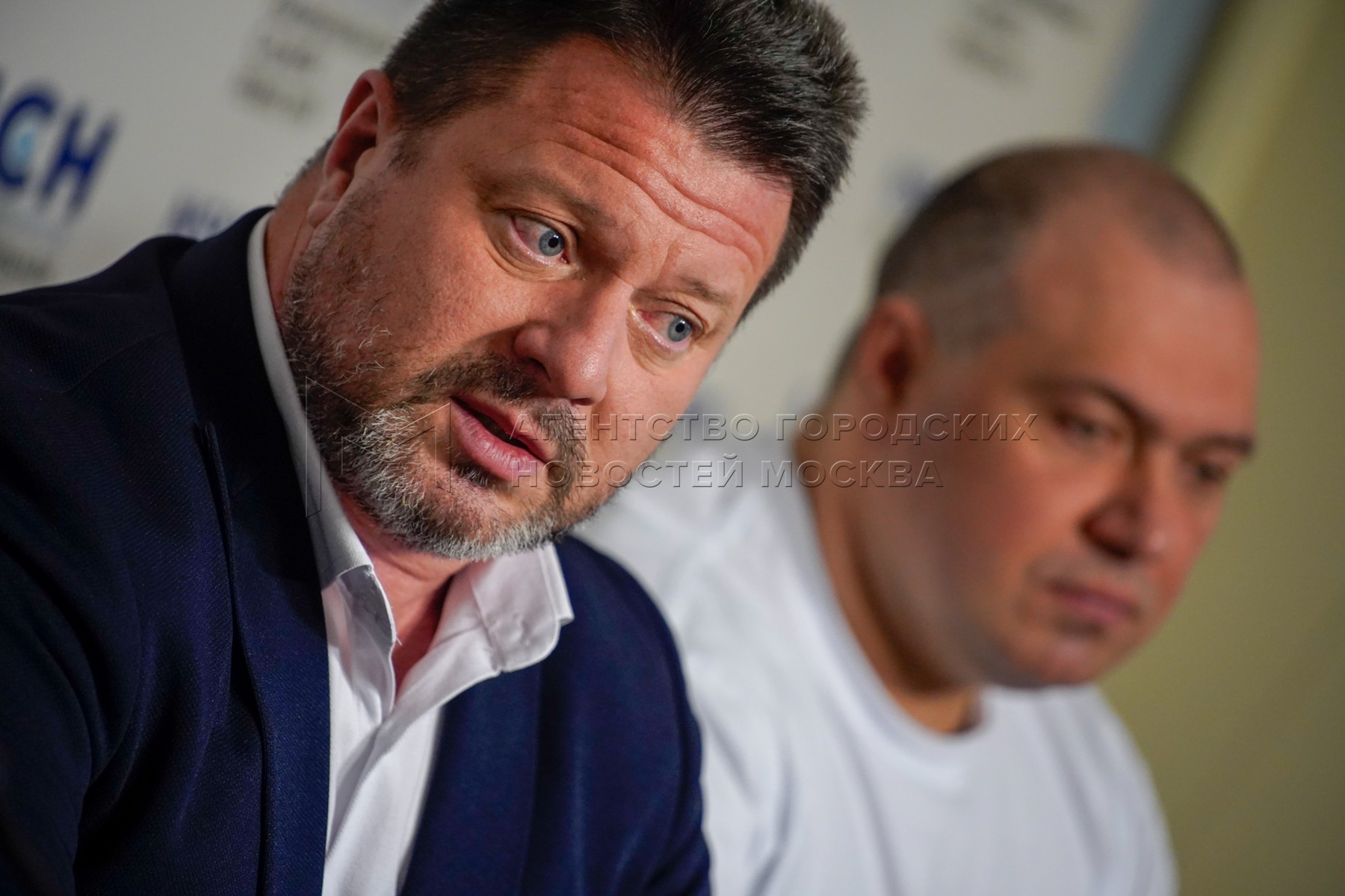 Рекордсмен мира по силовому экстриму Михаил Кокляев и заместитель президента Федерации силового экстрима России, рекордсмен мира по буксировке многотонной техники и силовым номерам Сергей Агаджанян на пресс-конференции «Русские Халки: как развивается силовой экстрим в России?».