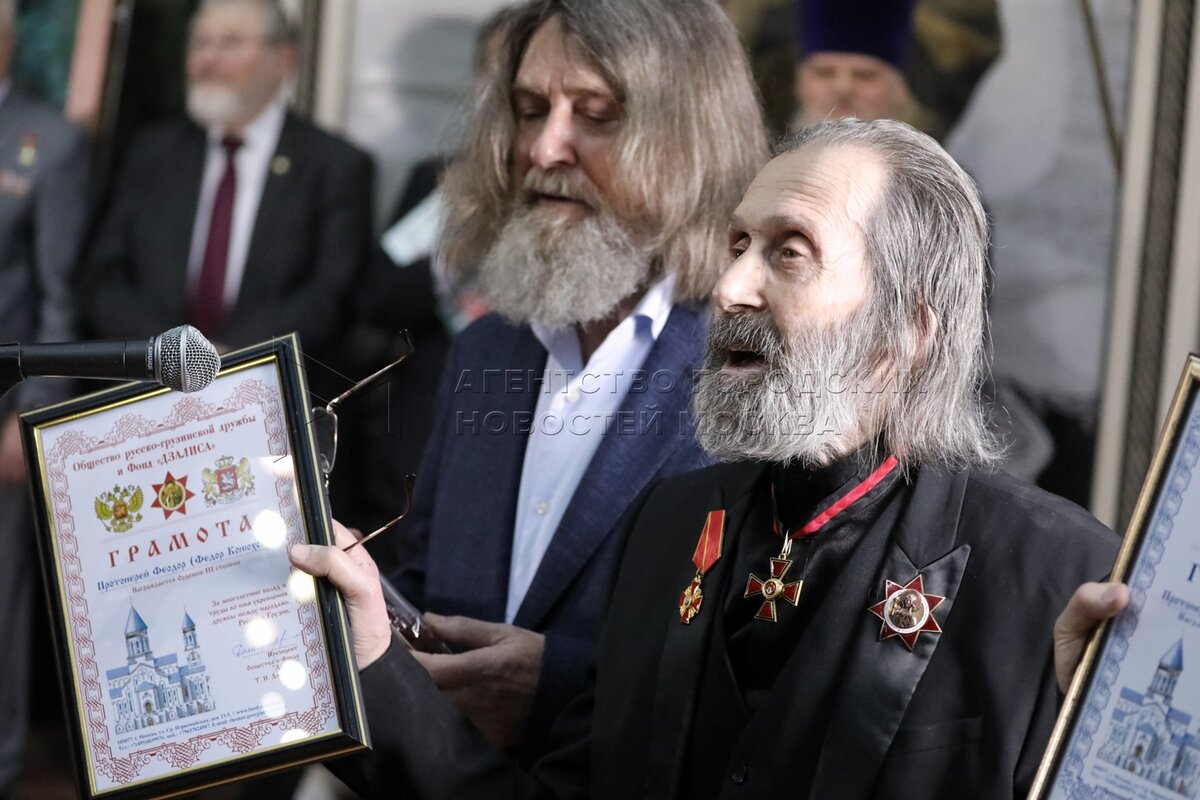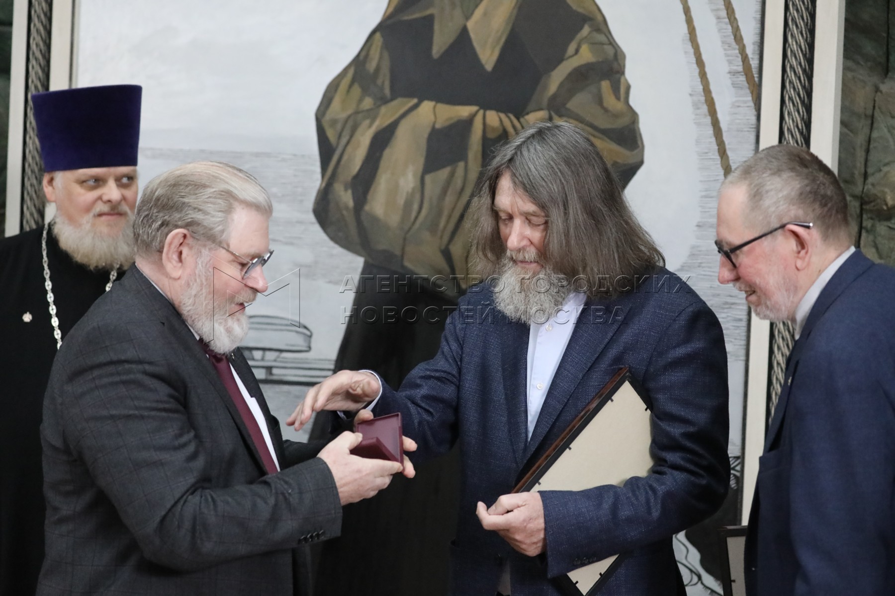 - Описание: Член Патриаршего совета по культуре, протоиерей Леонид Калинин, первый вице-президент Российской академии художеств (РАХ), академик РАХ, художник Виктор Калинин, путешественник, академик РАХ Федор Конюхов и художник Александр Теслик (слева направо) во время открытия выставки Федора Конюхова «Путешествие длиною в жизнь» в Галерее искусств Зураба Церетели.