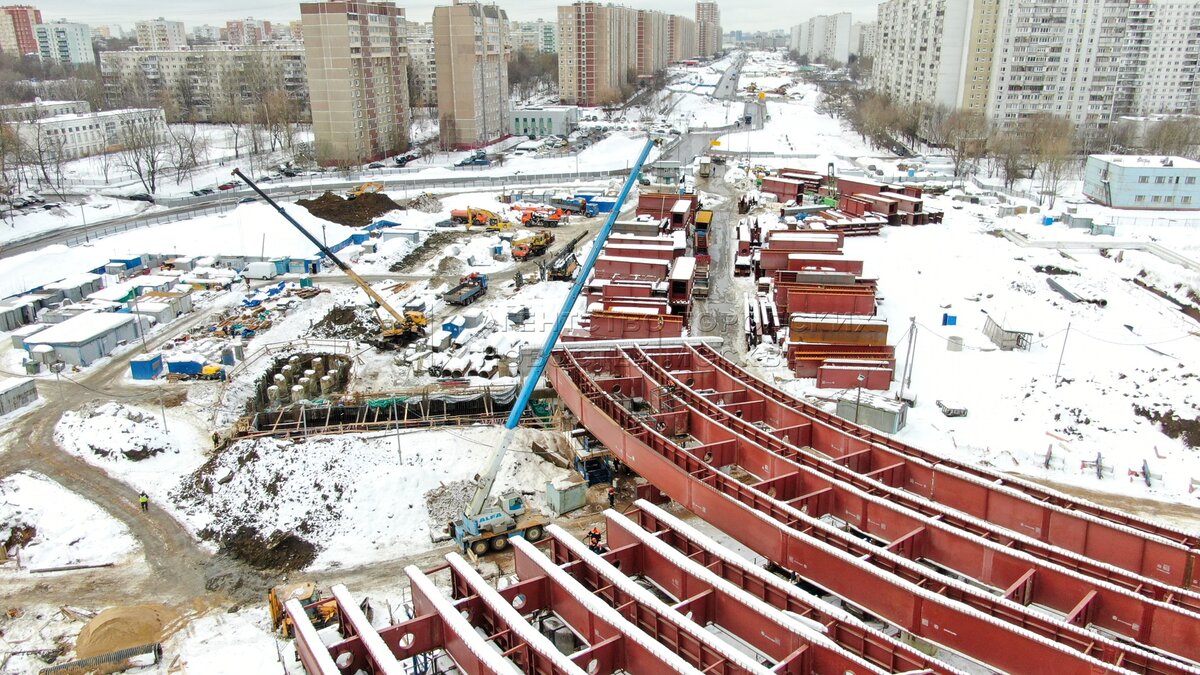 Вид с квадрокоптера на строительство участка Юго-Восточной хорды в составе Москов...