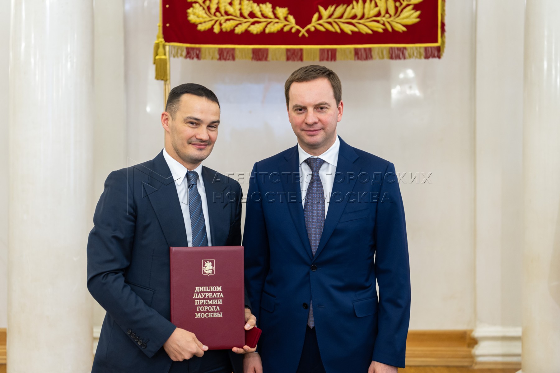 - Описание: Многократный чемпион мира по танцам, тренер спортивной школы олимпийского резерва № 29 «Хамовники» Алексей Сильде (слева), награжденный «За вклад в работу по развитию детско-юношеского спорта в столице», и руководитель Департамента спорта города Москвы Алексей Кондаранцев во время вручения премии города 2021 года в области физической культуры, спорта и туризма. Фото: Максим Мишин, пресс-служба мэра и правительства столицы.