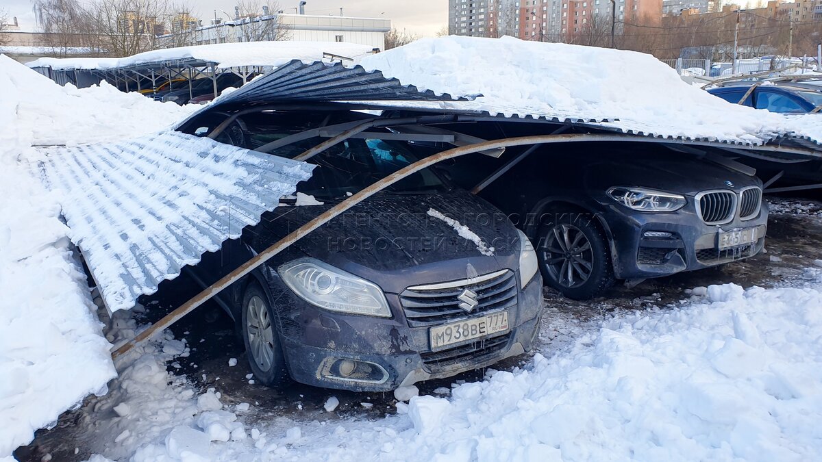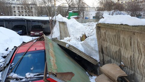 - Описание: Последствия обрушения металлических конструкций на частной крытой автостоянке по адресу: ул. Прокатная, д. 5а. В результате падения навеса был поврежден 21 автомобиль.