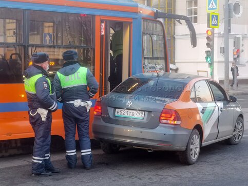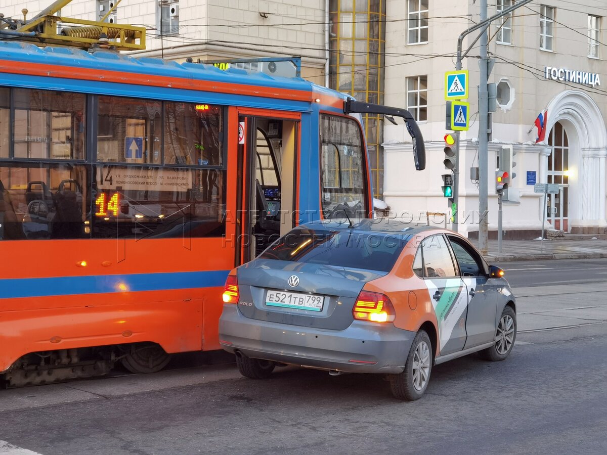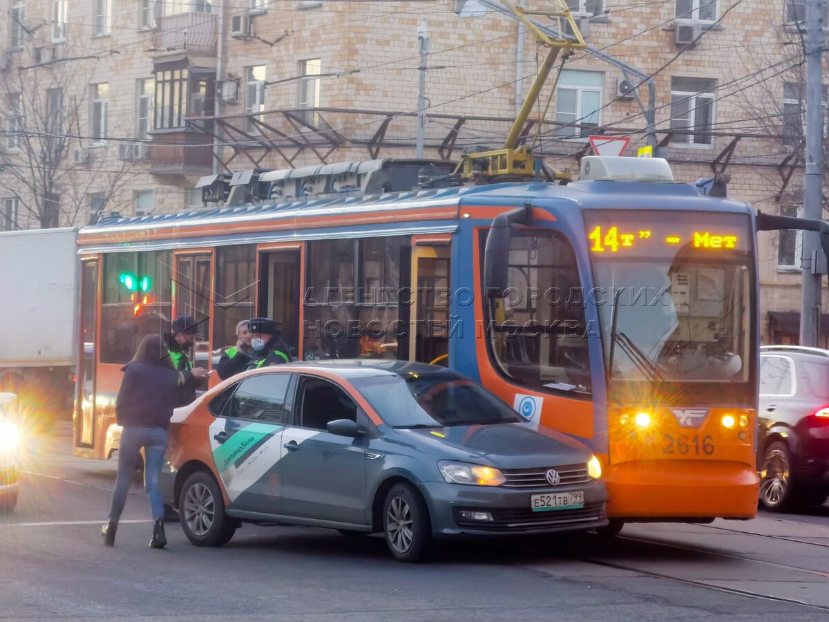 Последствия ДТП с участием трамвая и автомобиля каршеринга на пересечении ул. Вав...
