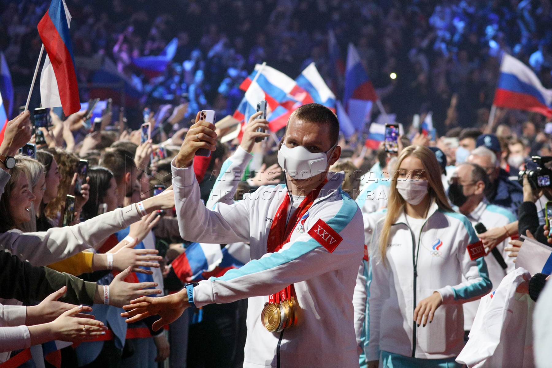 - Описание: Лыжник Александр Большунов (в центре), завоевавший три золотых, одну серебряную и одну бронзовую медали на Олимпийских играх 2022, во время торжественной встречи на «ВТБ Арене» спортсменов сборной России после участия на XXIV Олимпийских зимних играх 2022 года в Пекине.