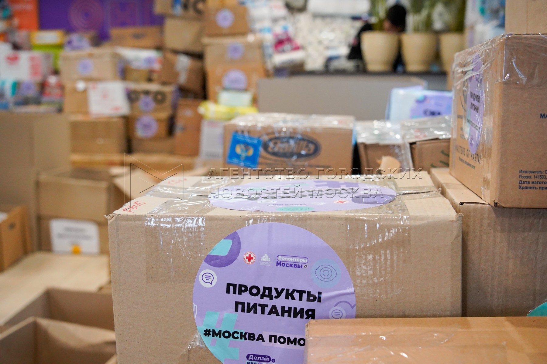 - Описание: Штаб по сбору гуманитарной помощи от торговых сетей для семей из Донецкой и Луганской народных республик (ДНР и ЛНР) в штабе ресурсного центра «Мосволонтер» на Ленинградском проспекте.