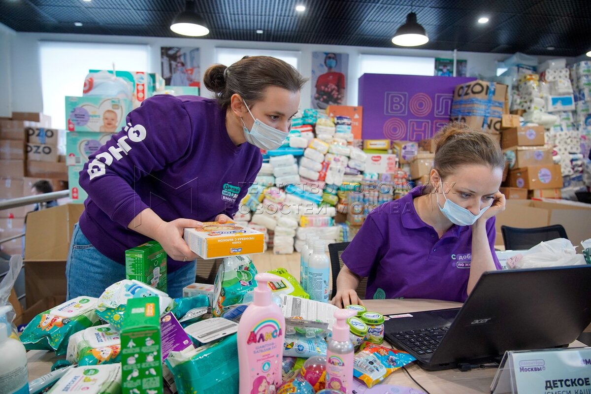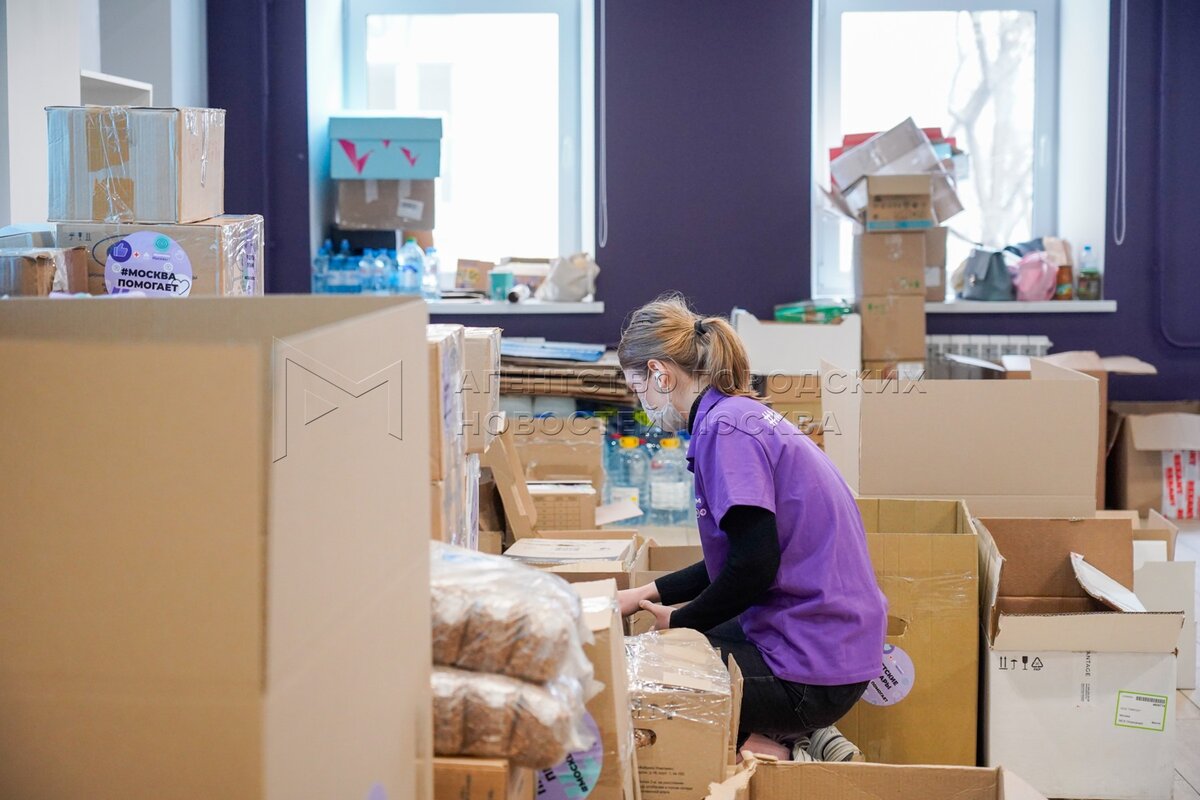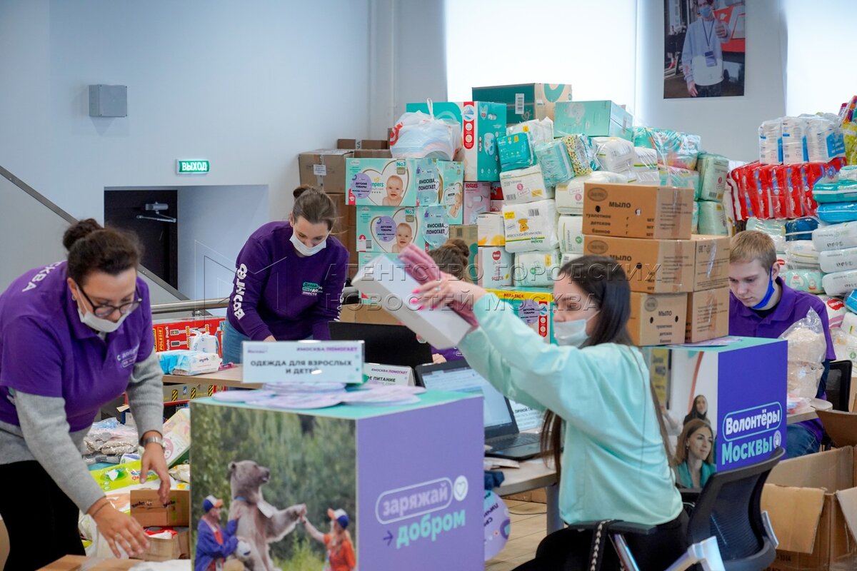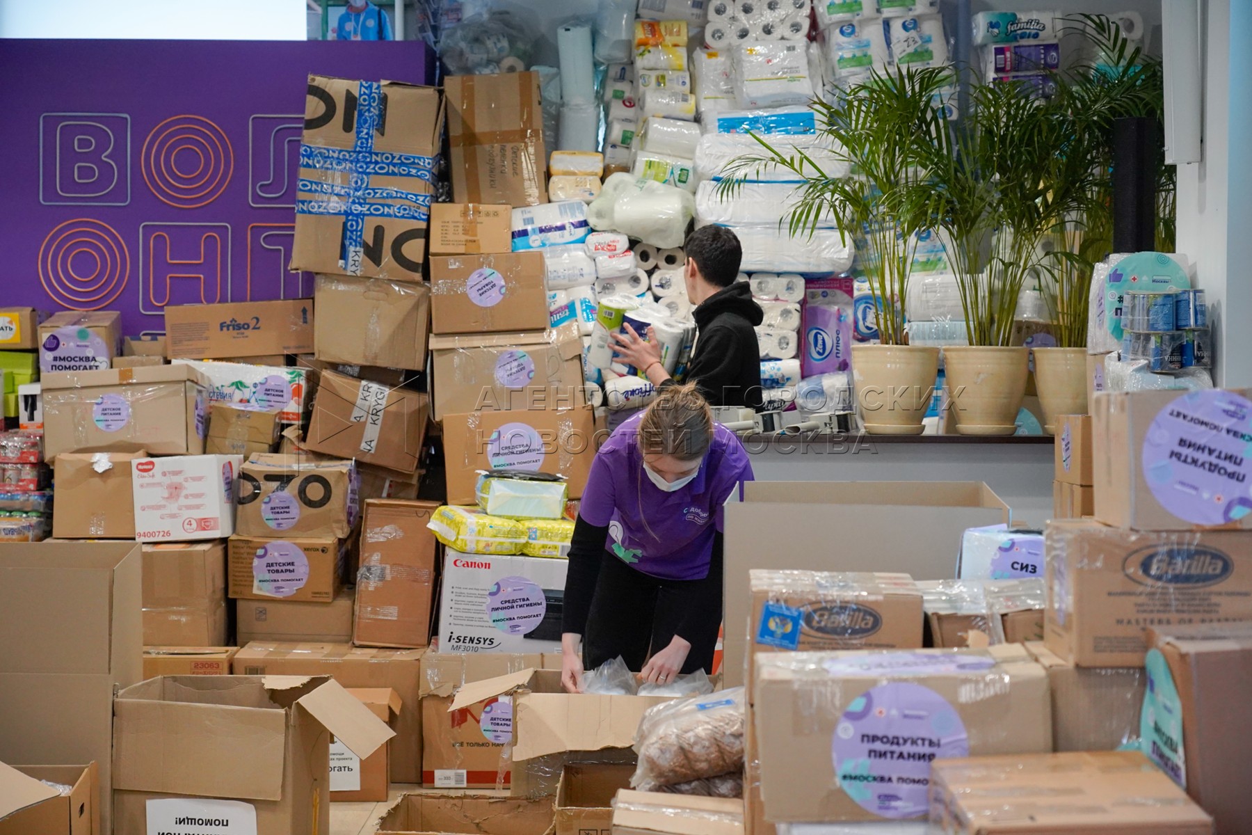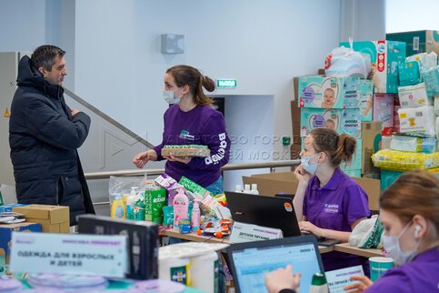 - Описание: Штаб по сбору гуманитарной помощи от торговых сетей для семей из Донецкой и Луганской народных республик (ДНР и ЛНР) в штабе ресурсного центра «Мосволонтер» на Ленинградском проспекте.