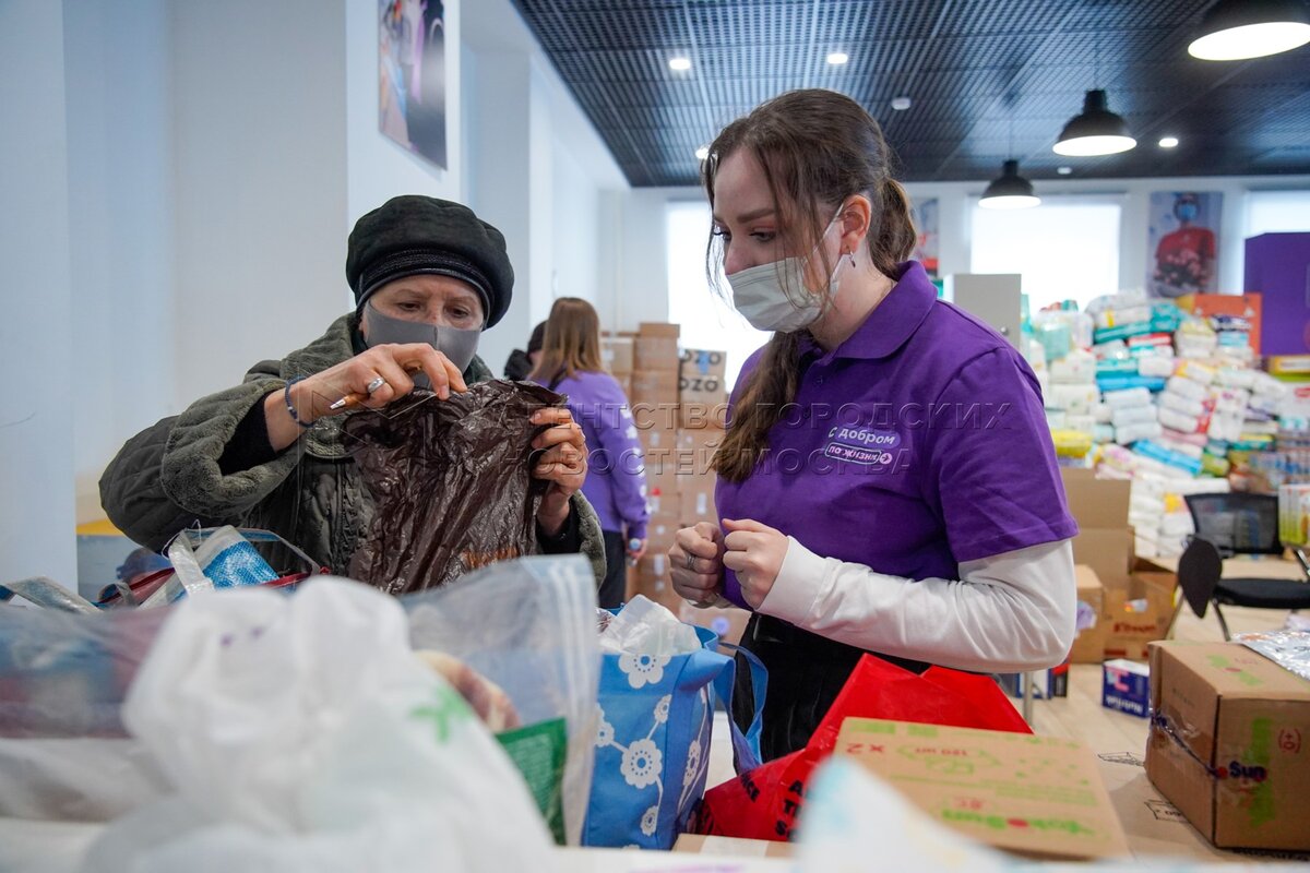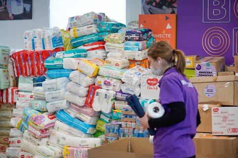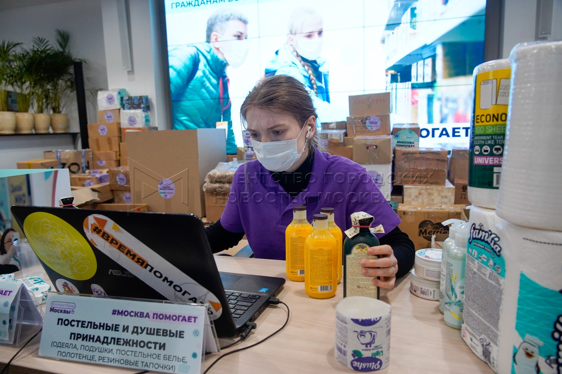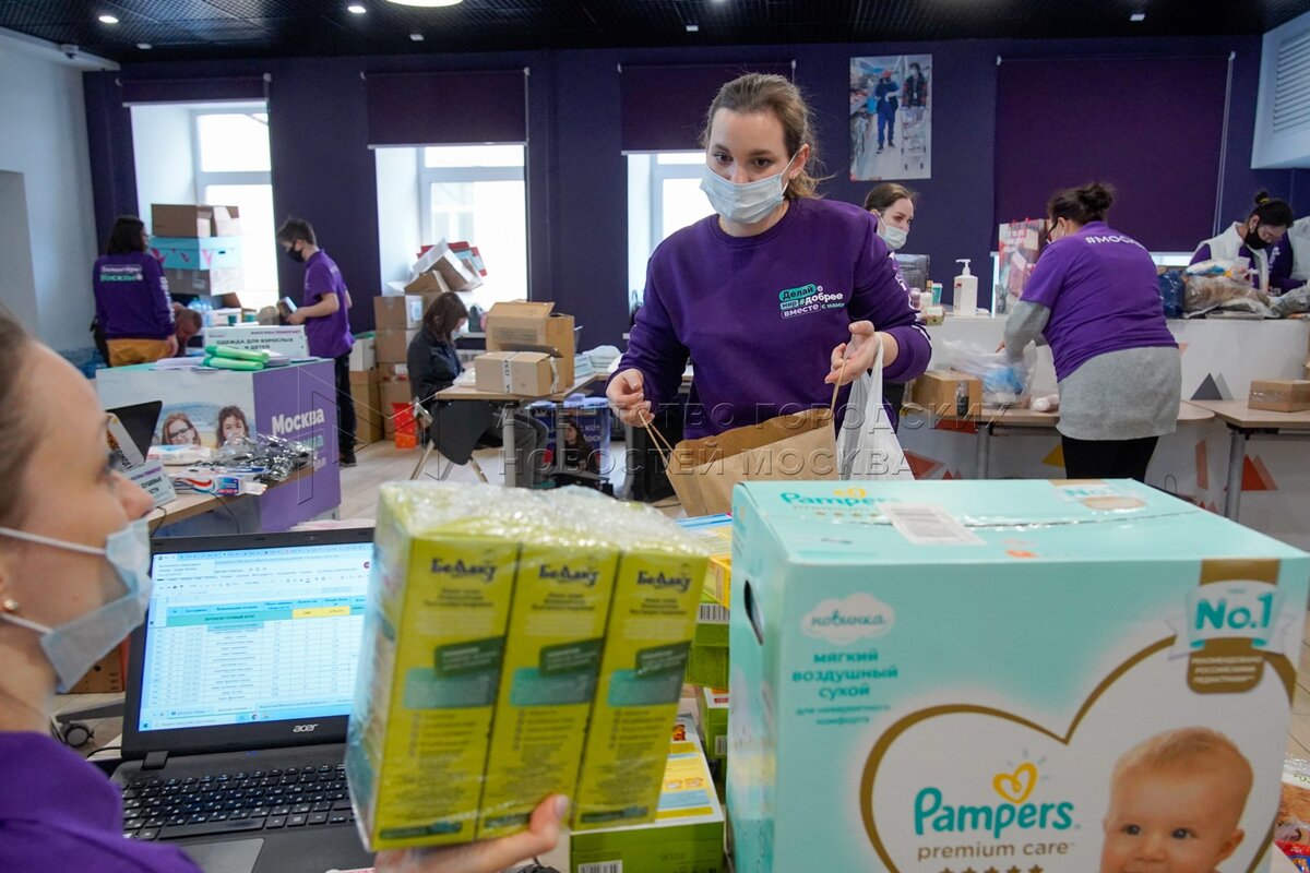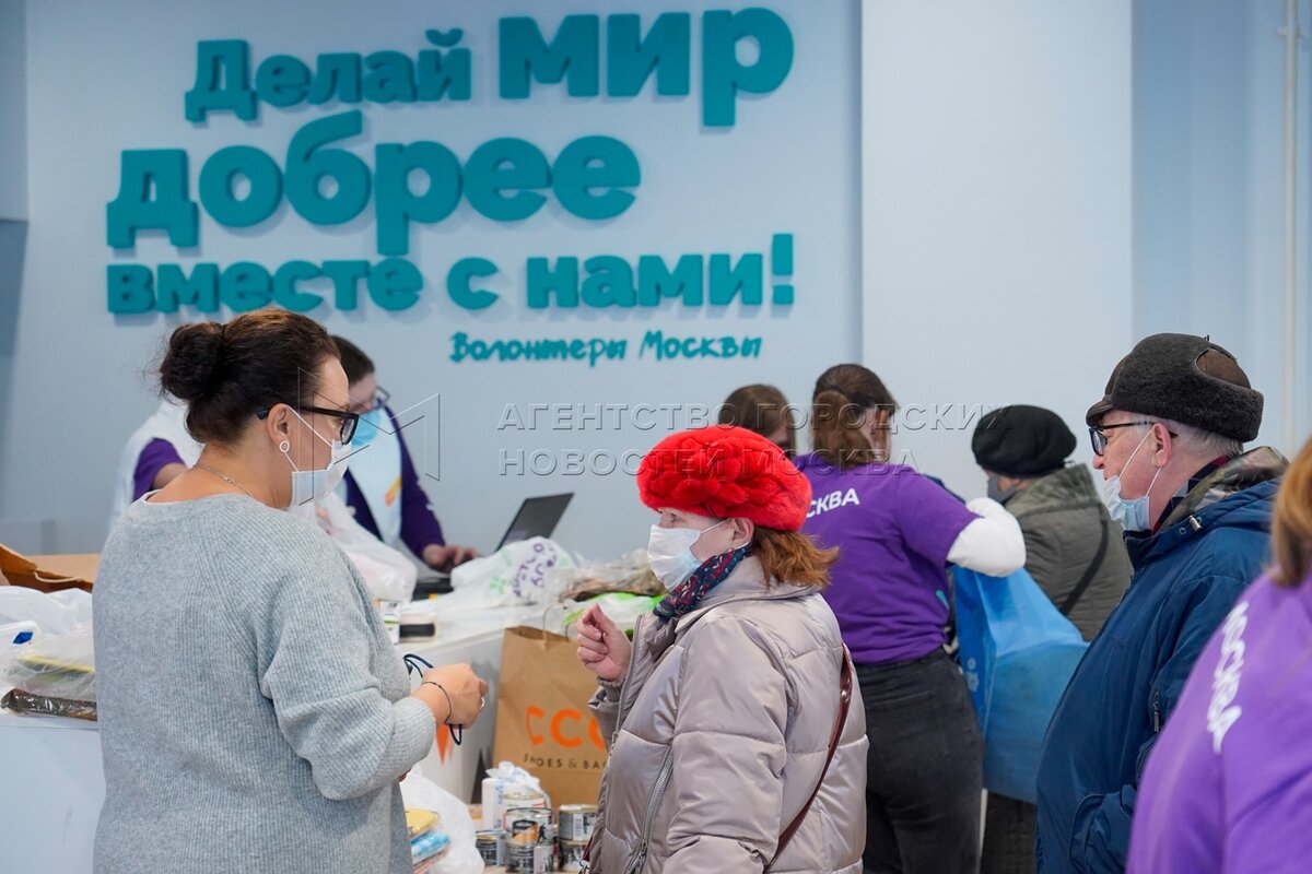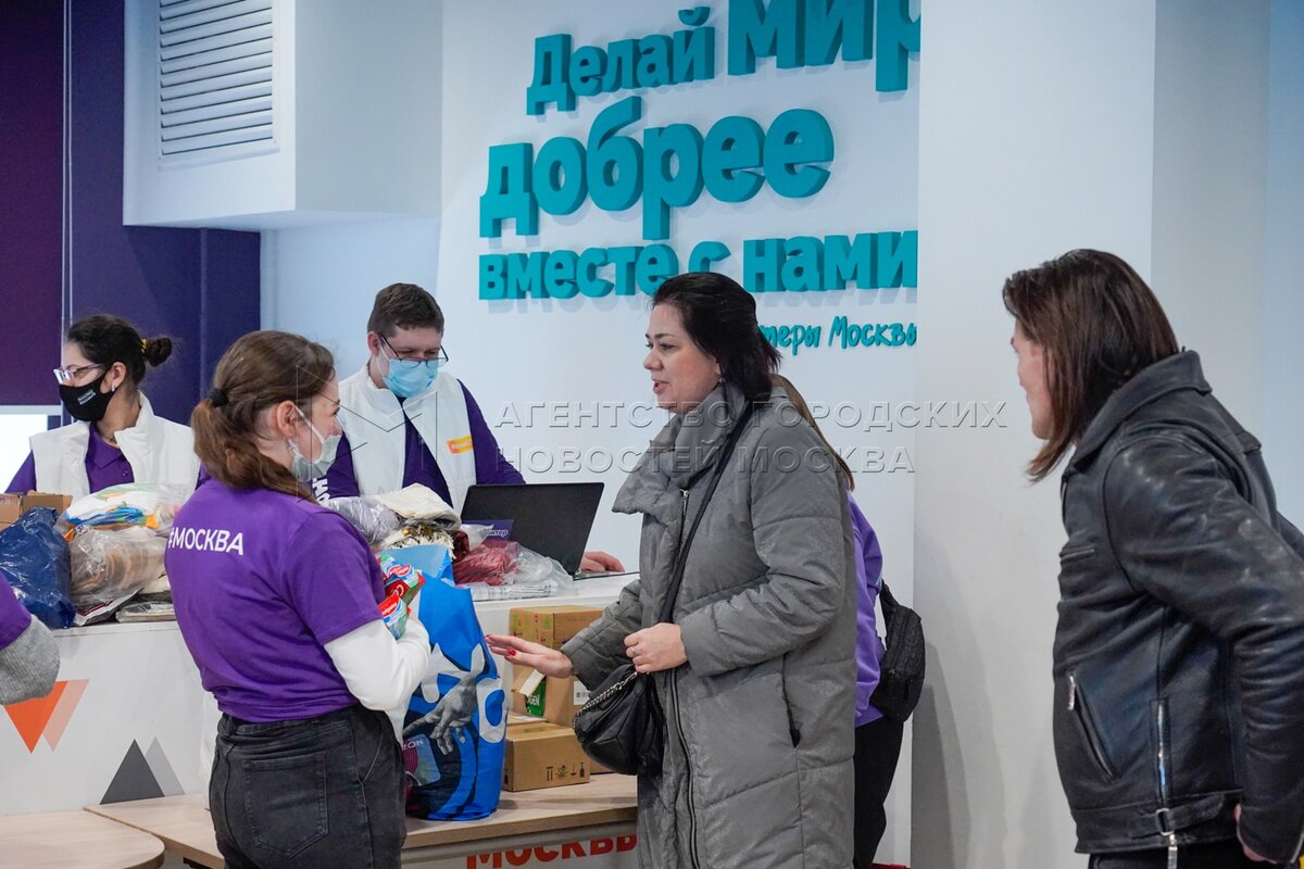 - Описание: Штаб по сбору гуманитарной помощи от торговых сетей для семей из Донецкой и Луганской народных республик (ДНР и ЛНР) в штабе ресурсного центра «Мосволонтер» на Ленинградском проспекте.