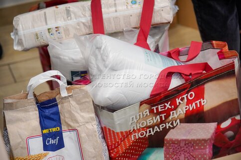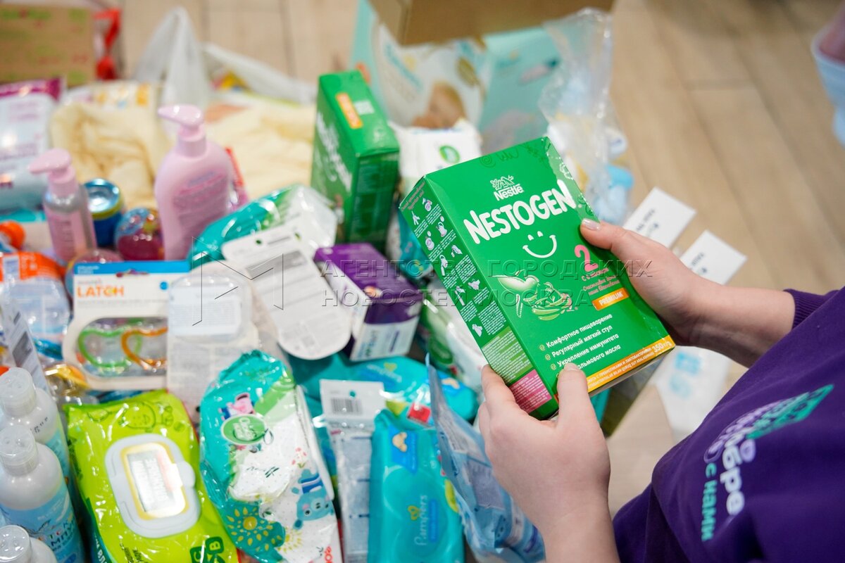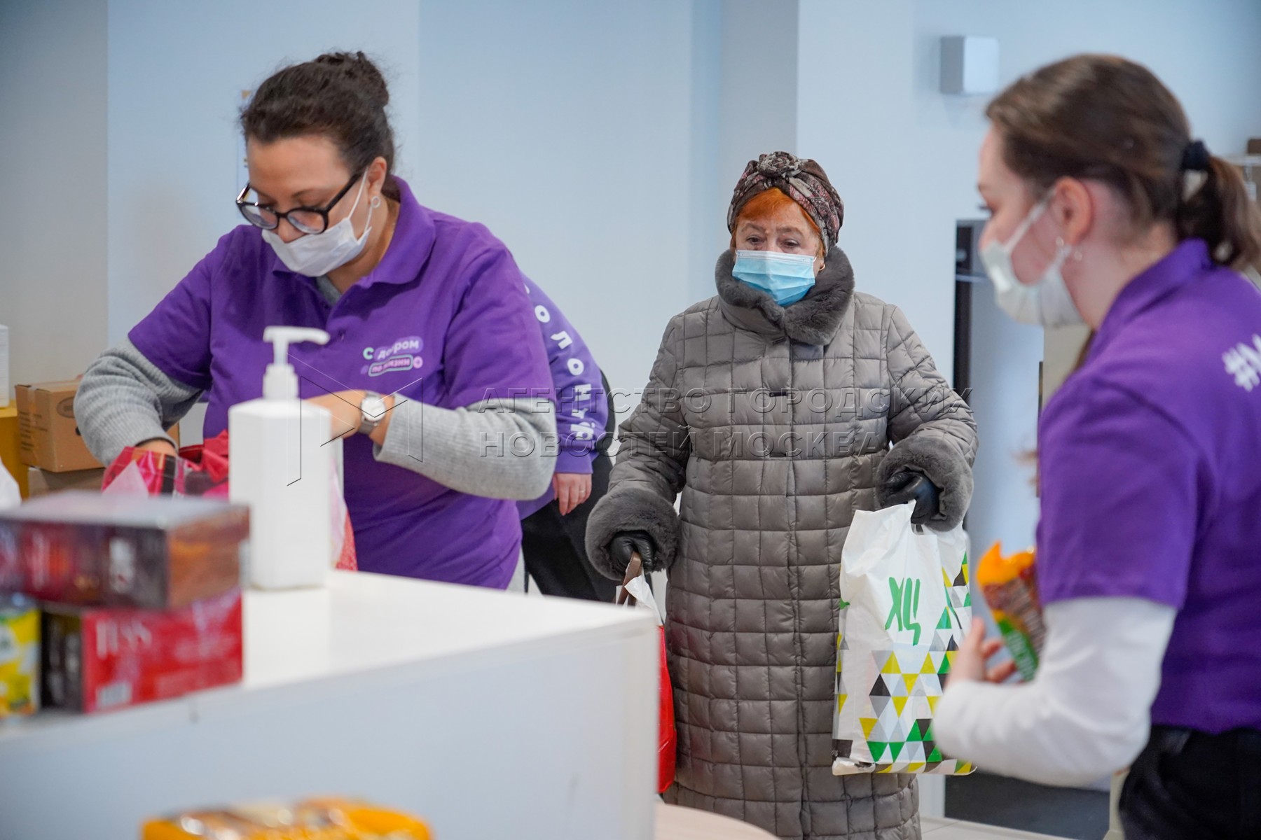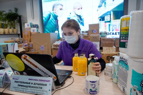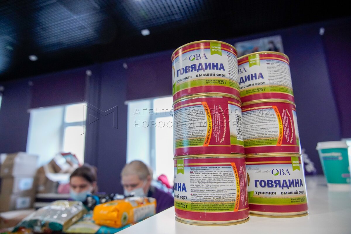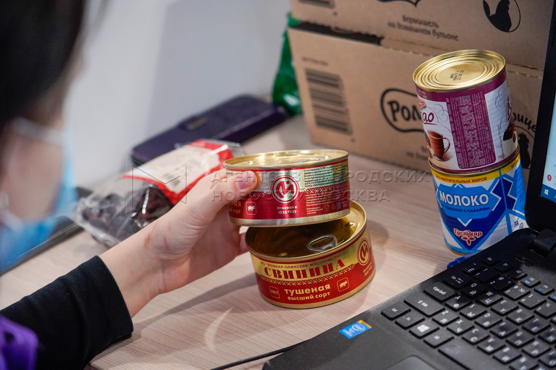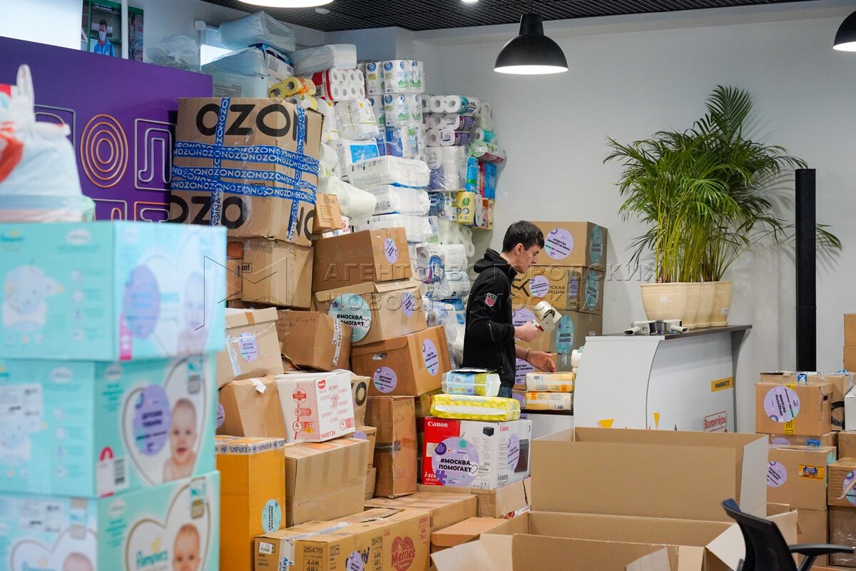 Штаб по сбору гуманитарной помощи от торговых сетей для семей из Донецкой и Луганской народных республик (ДНР и ЛНР) в штабе ресурсного центра «Мосволонтер» на Ленинградском проспекте.