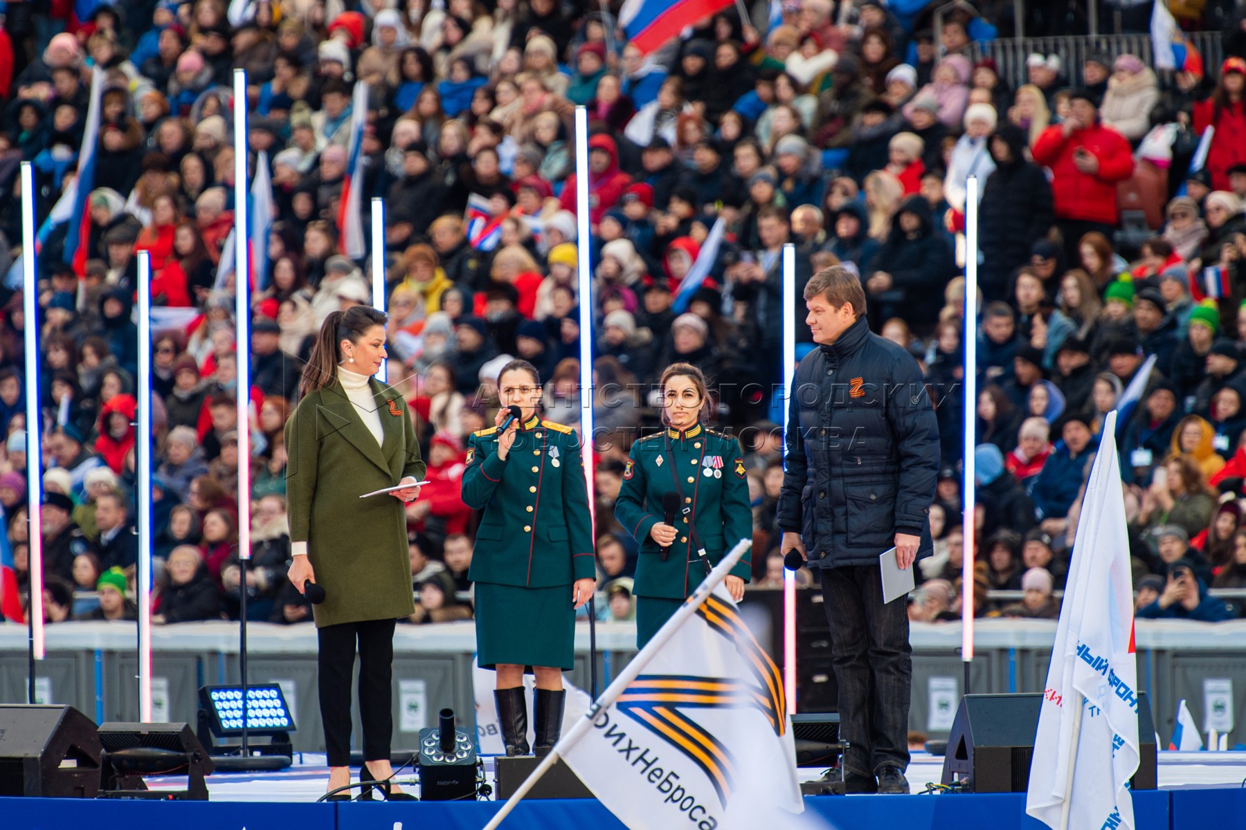 Певица Виктория Дайнеко (слева) во время концерта-митинга в «Лужниках» в честь го...