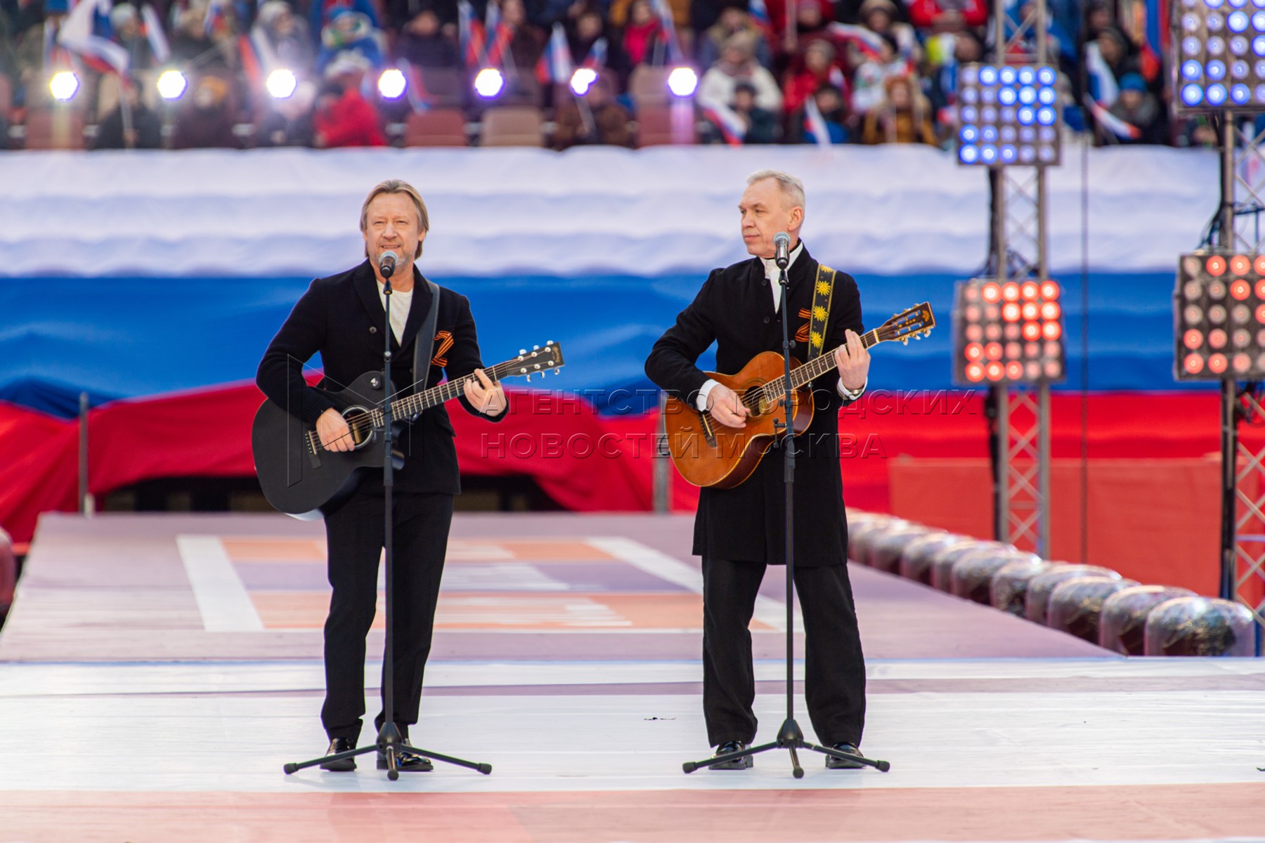 Певец Олег Газманов (в центре) во время концерта-митинга в «Лужниках» в честь год...