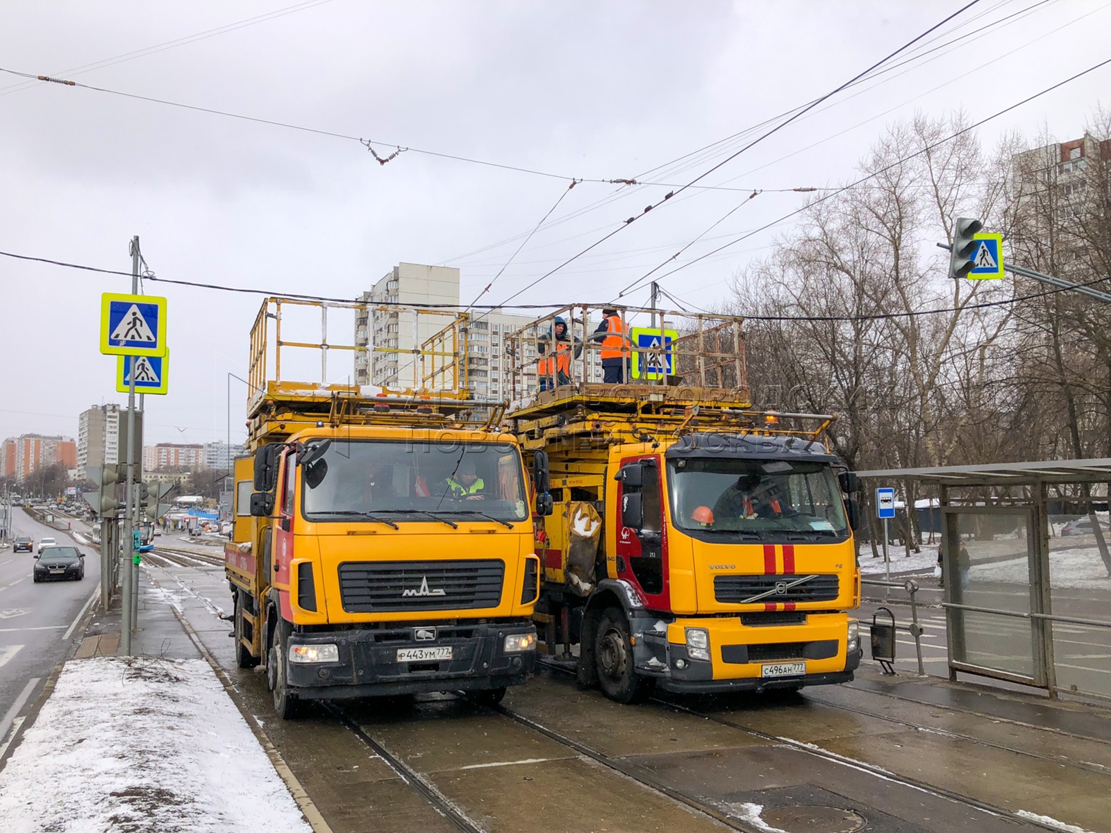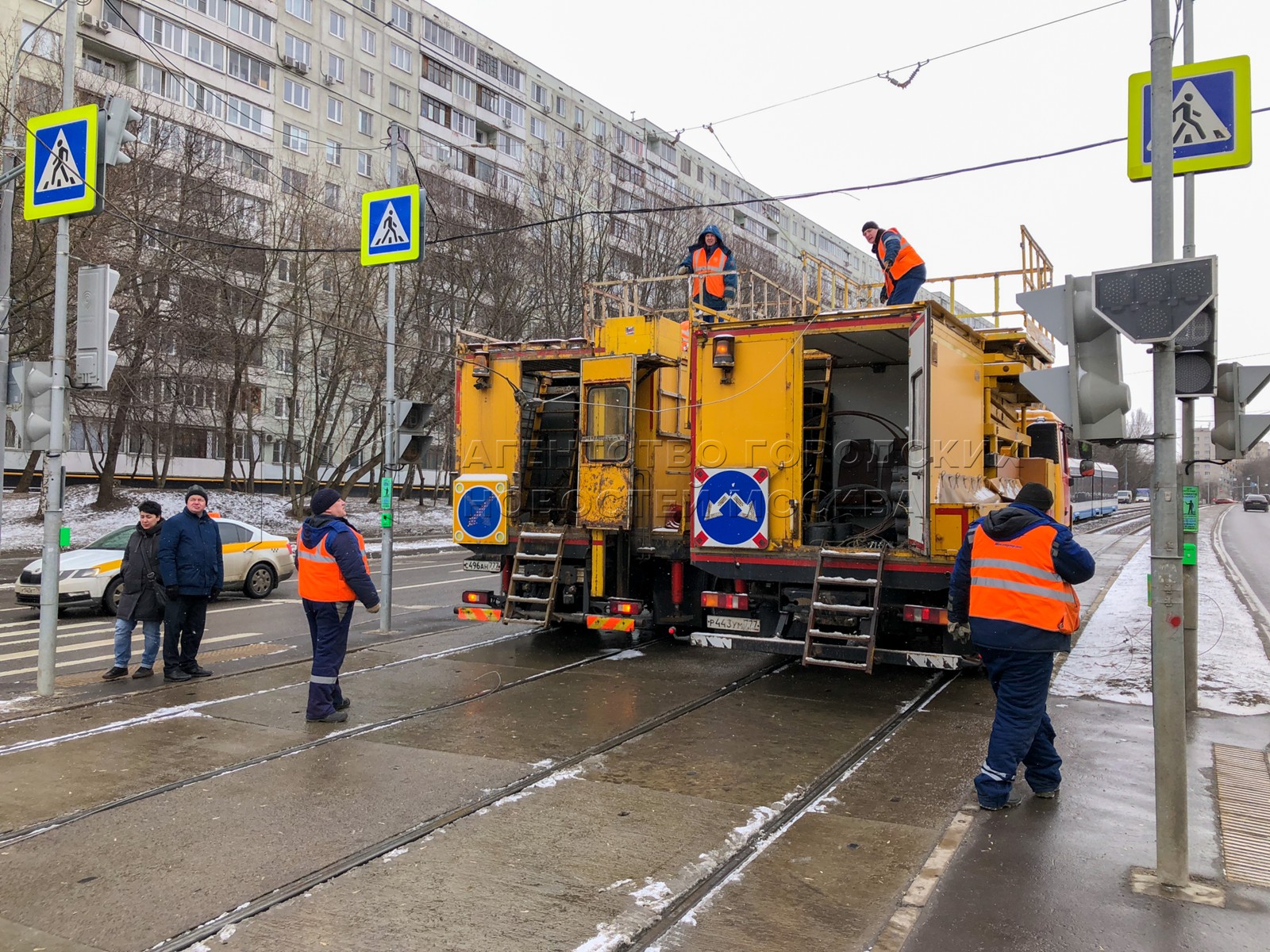 Устранение последствий обрыва контактной сети трамваев на юге Москвы, в районе д....