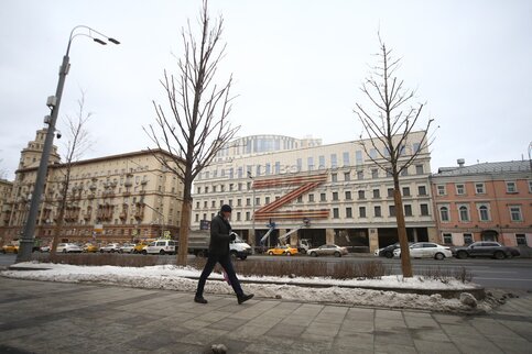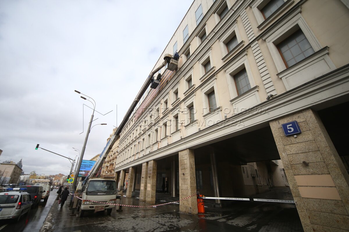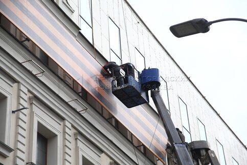 • Заголовок: Монтаж символа спецоперации на Украине на фасаде Московского театра Олега Табакова