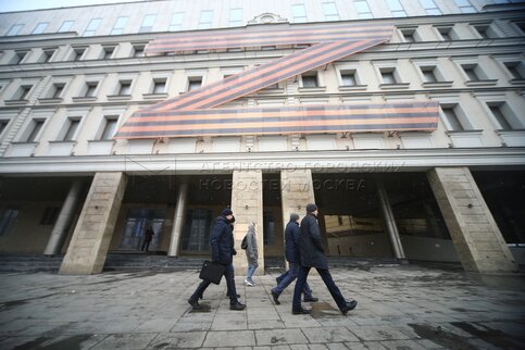 • Описание: Монтаж символа спецоперации на Украине на фасаде Московского театра Олега Табакова