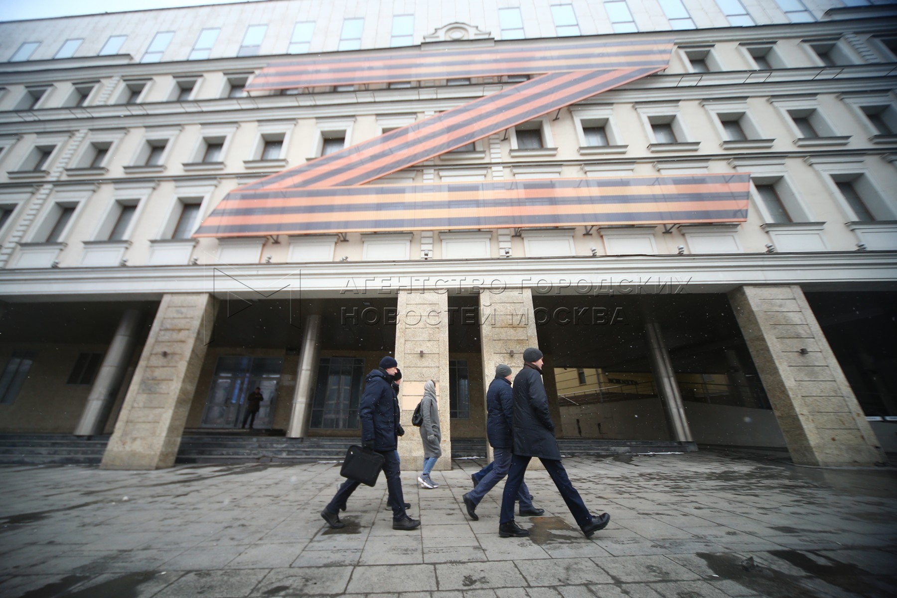 Монтаж символа спецоперации на Украине на фасаде Московского театра Олега Табаков...