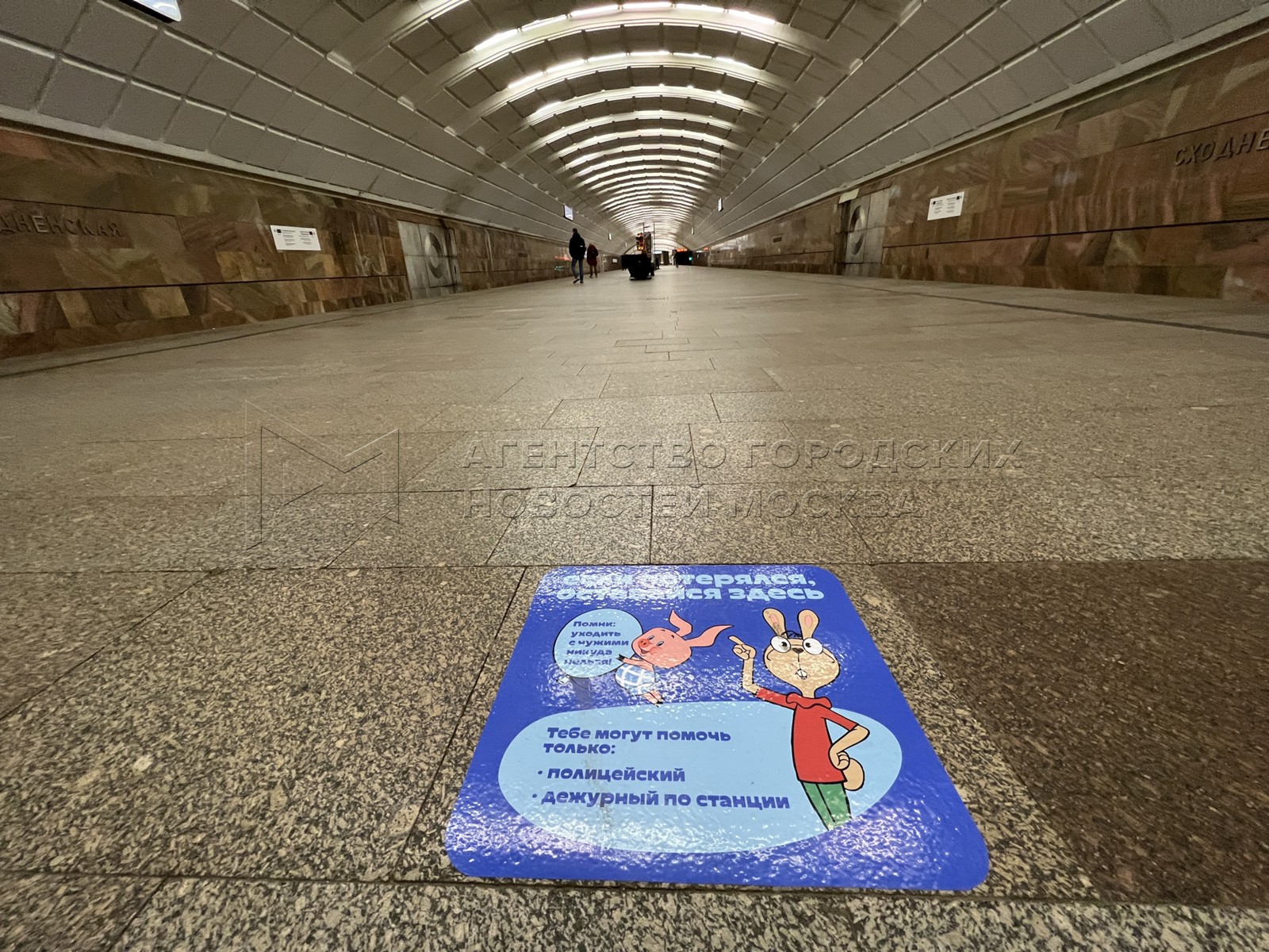 • Описание: Напольные стикеры «Если потерялся, оставайся здесь» в Московском метрополитене.