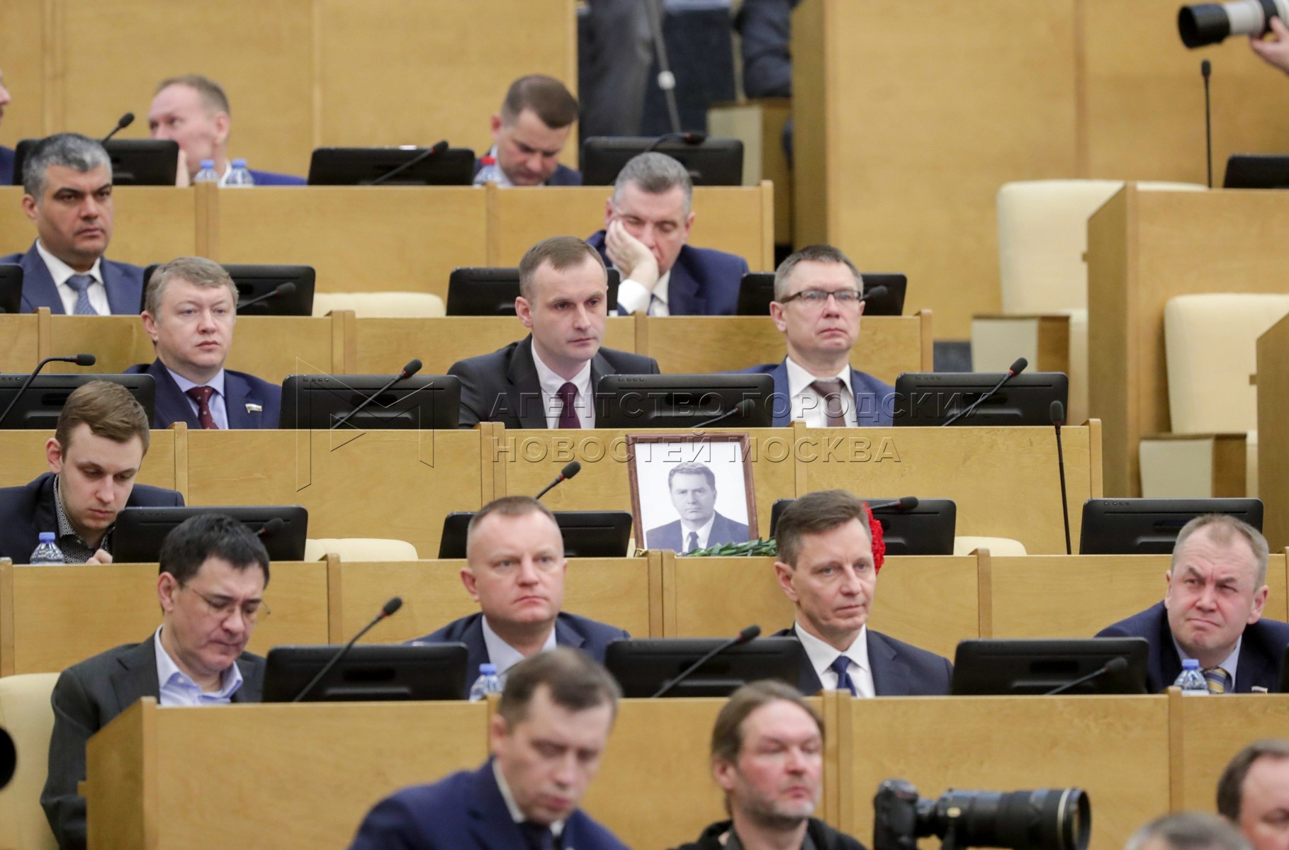 Цветы и фотография в память о лидере ЛДПР Владимире Жириновском во время пленарно...