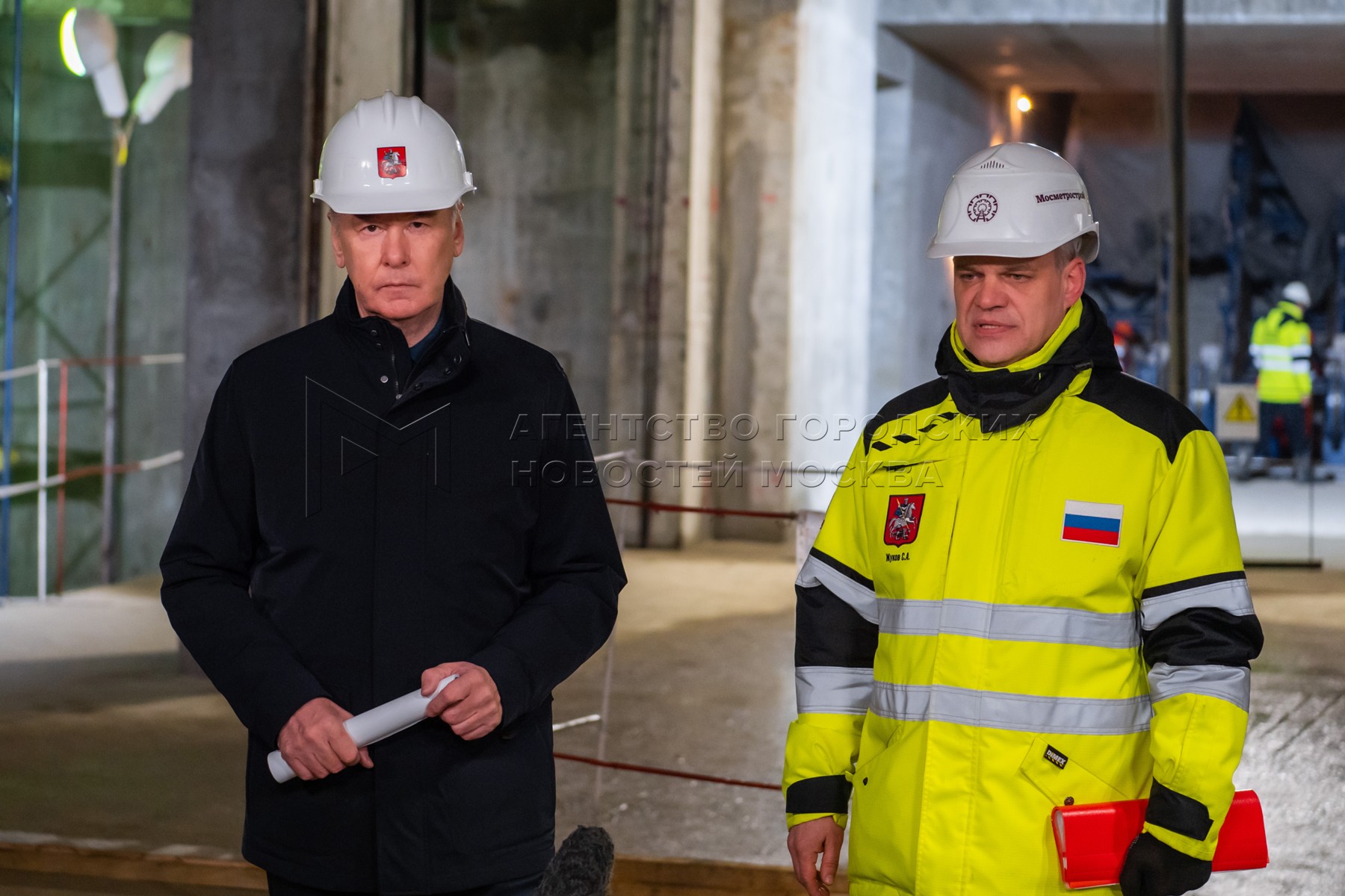 Мэр Москвы Сергей Собянин (слева) во время осмотра хода строительства станции мет...