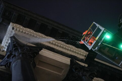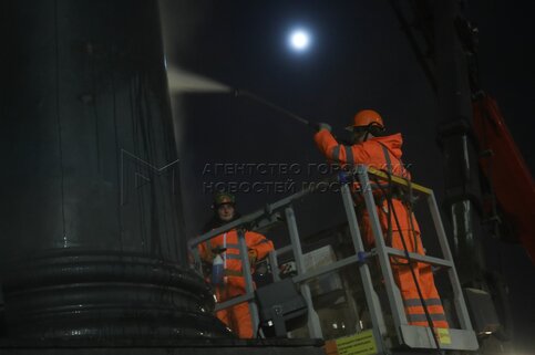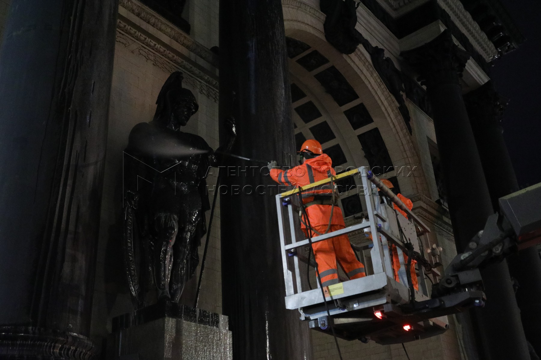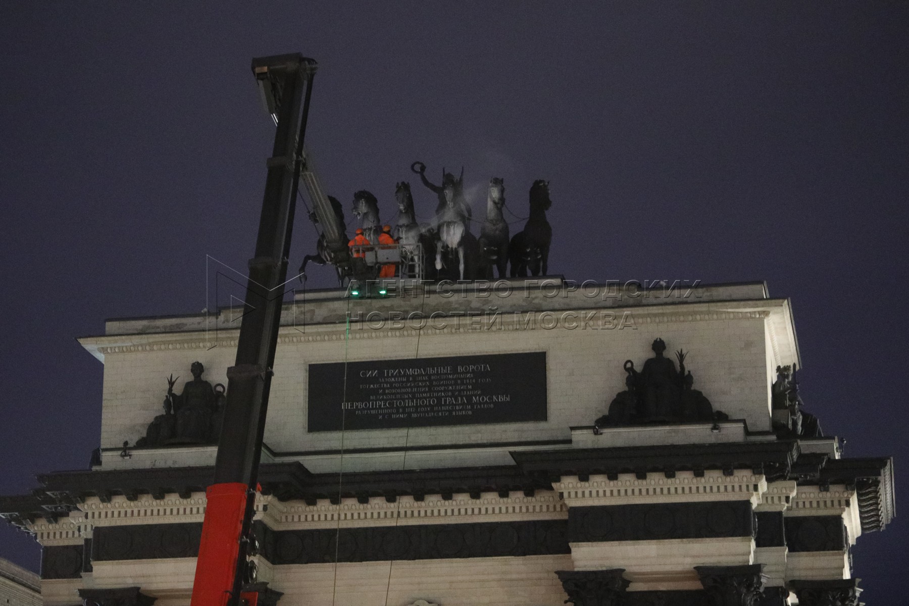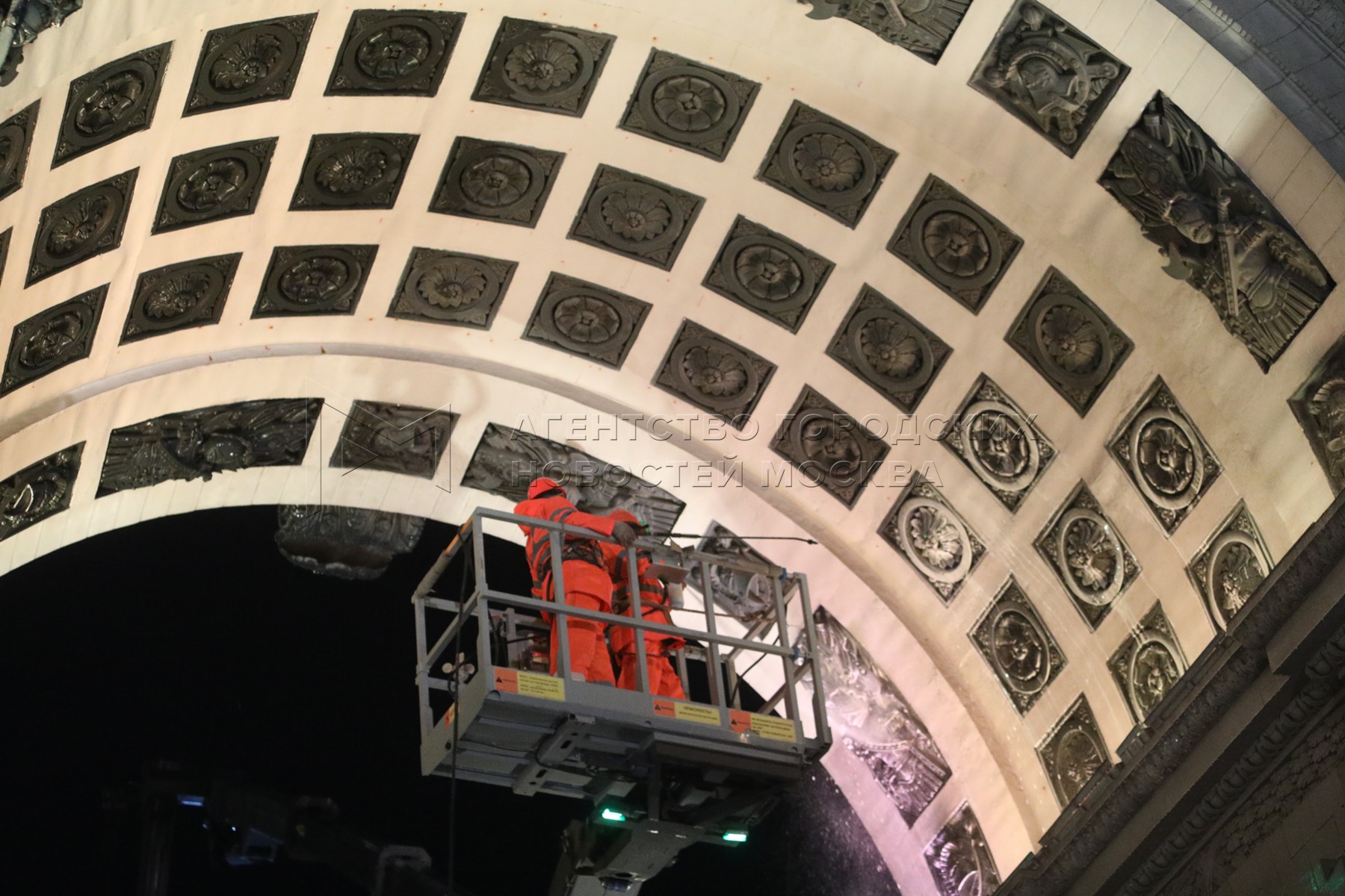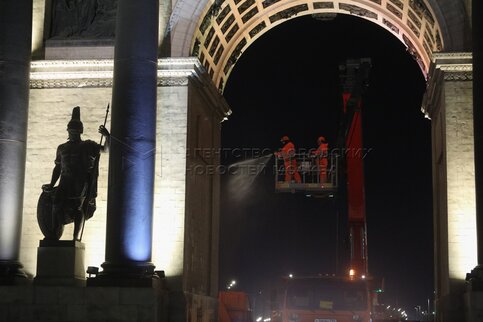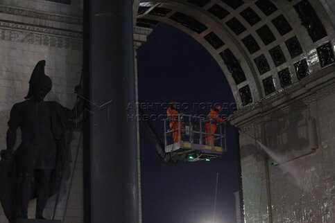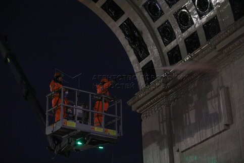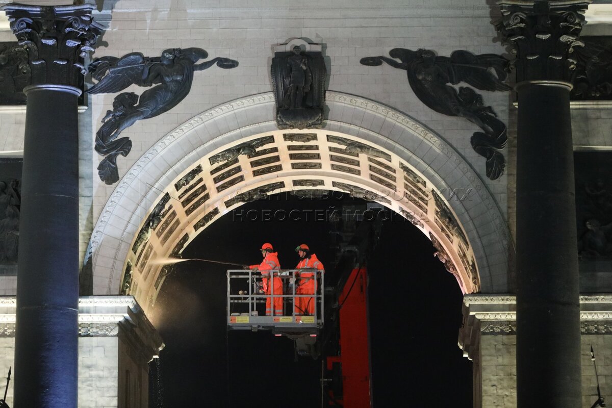 Промывка Триумфальной арки в рамках подготовки города к весенне-летнему сезону.