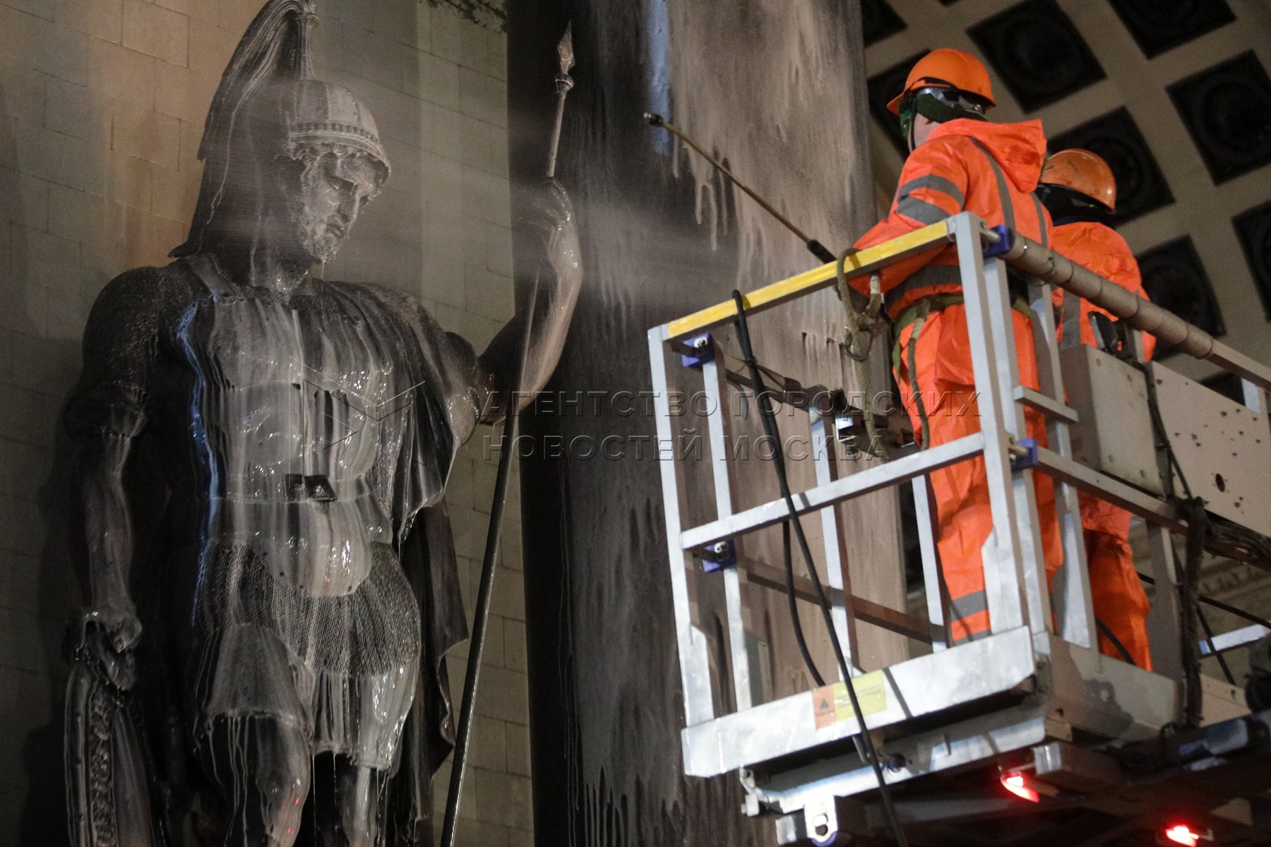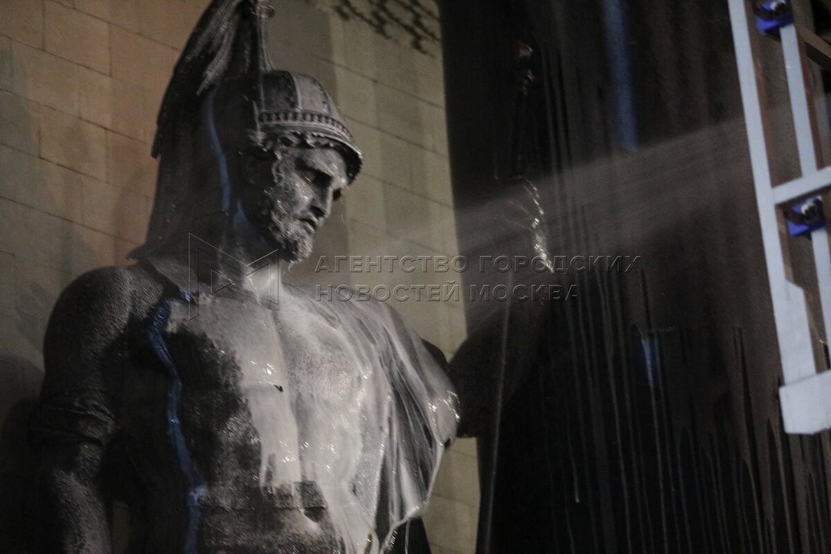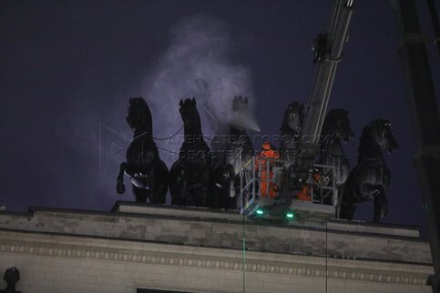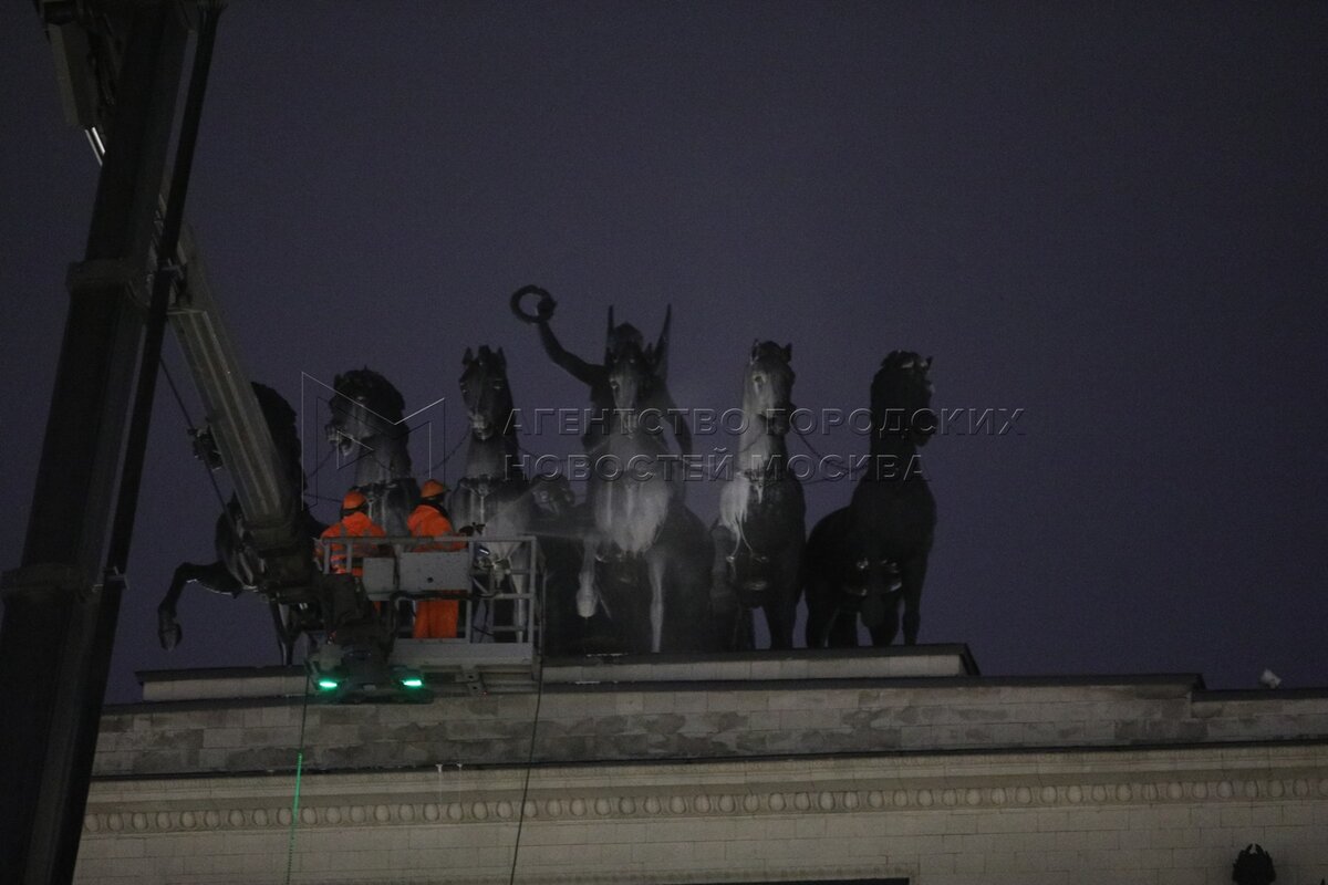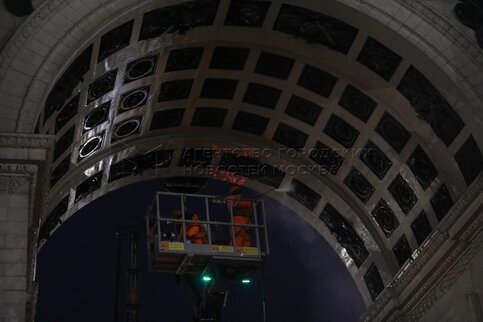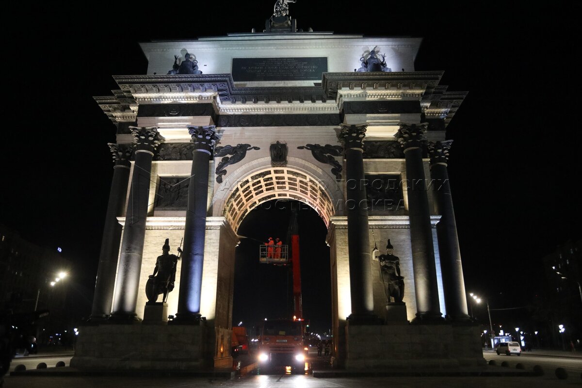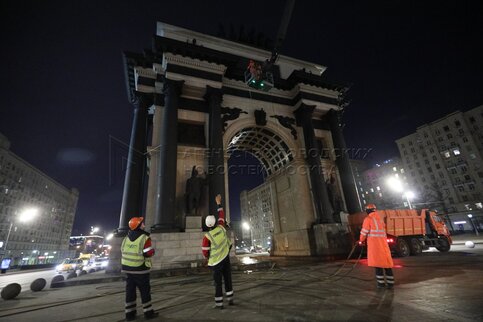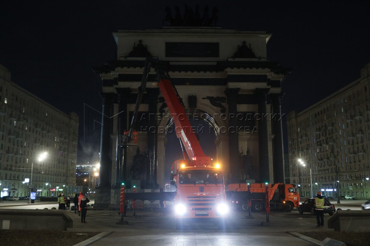 Промывка Триумфальной арки в рамках подготовки города к весенне-летнему сезону.