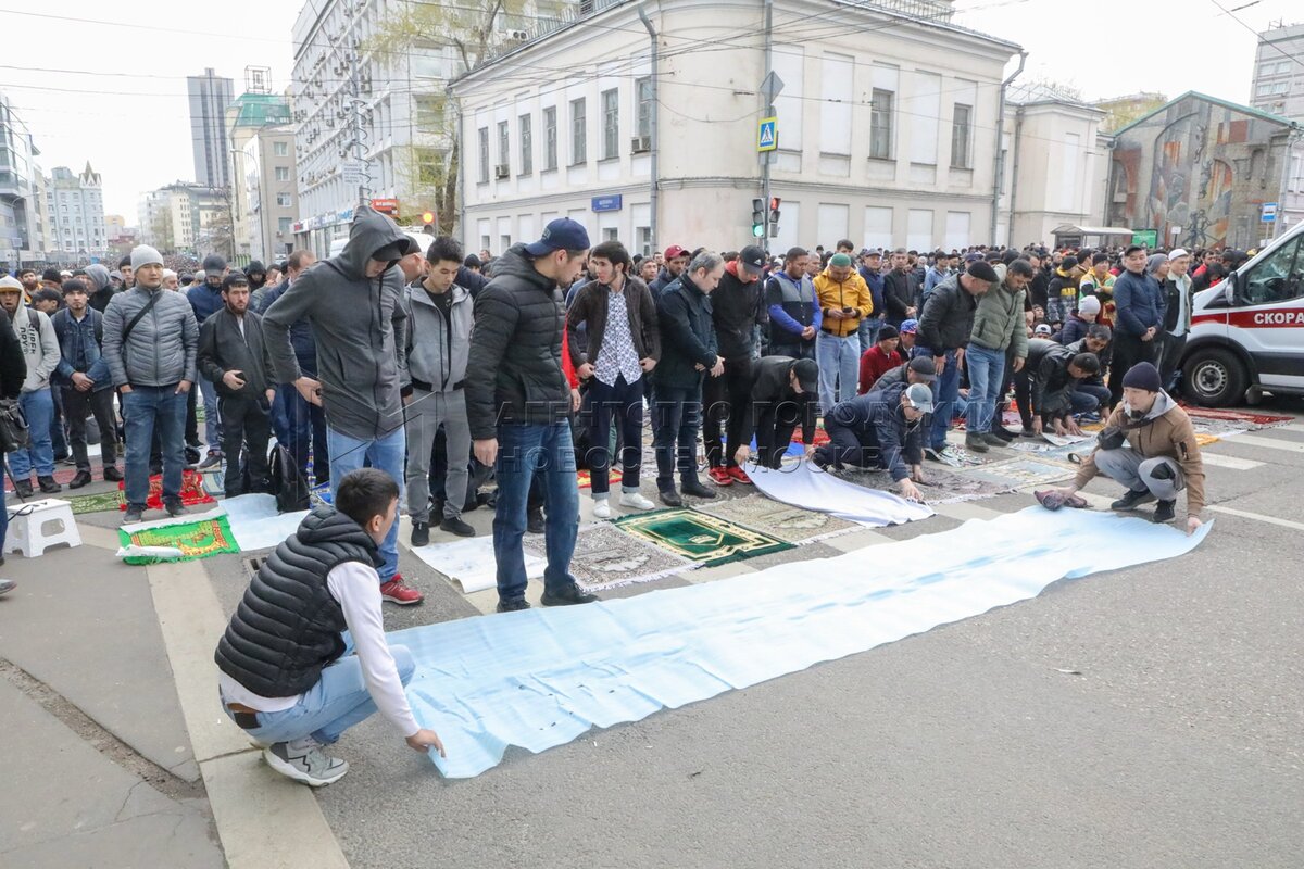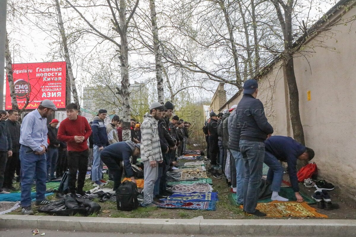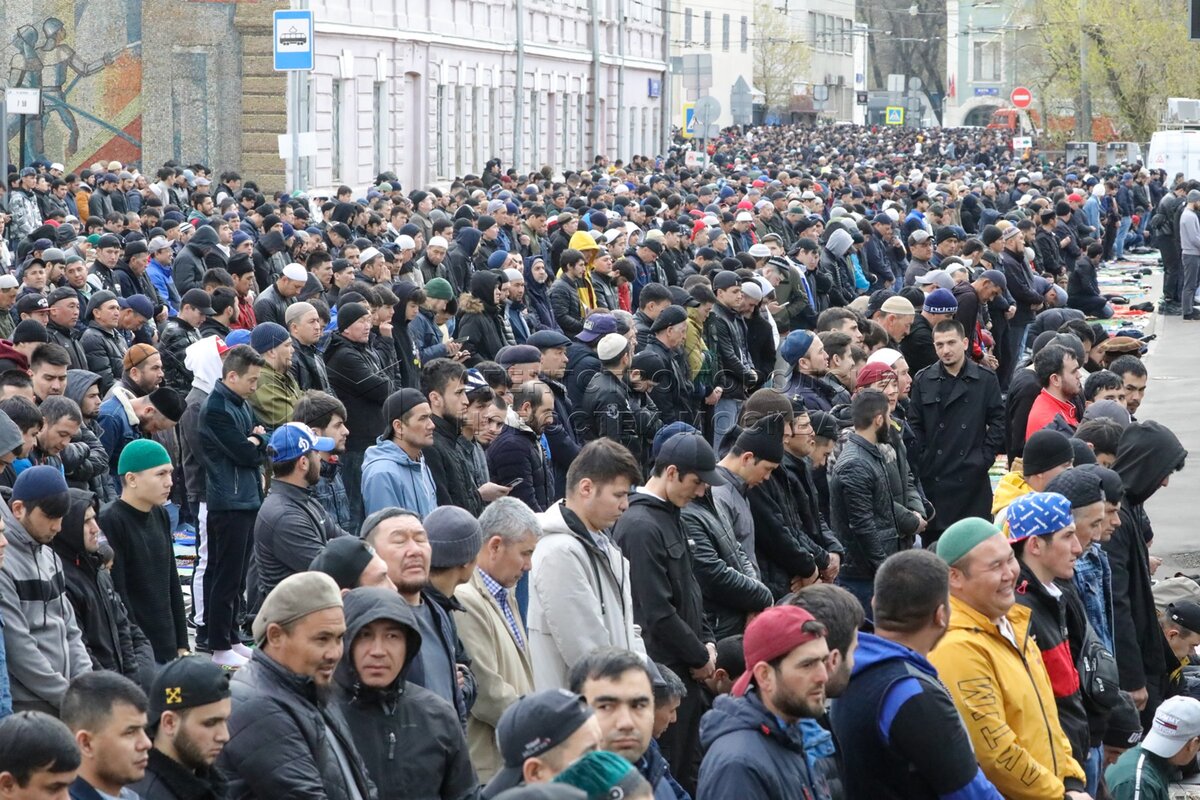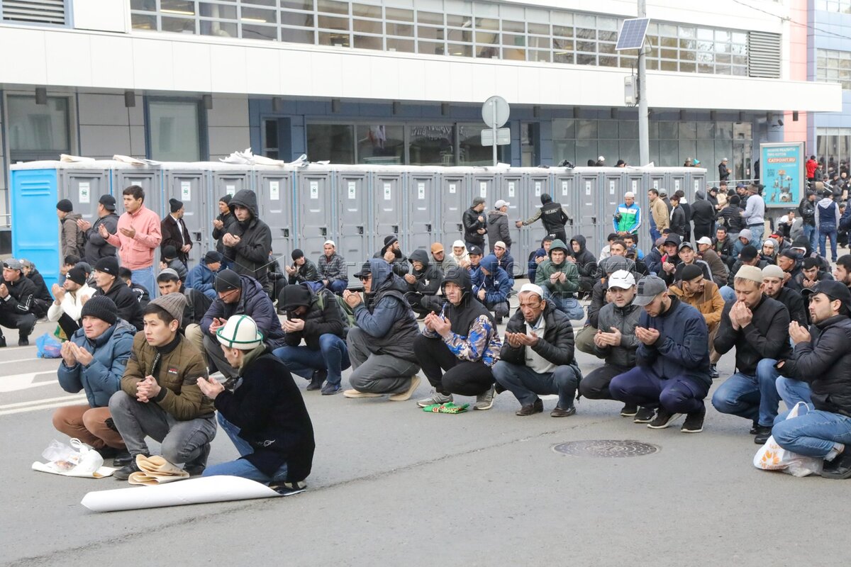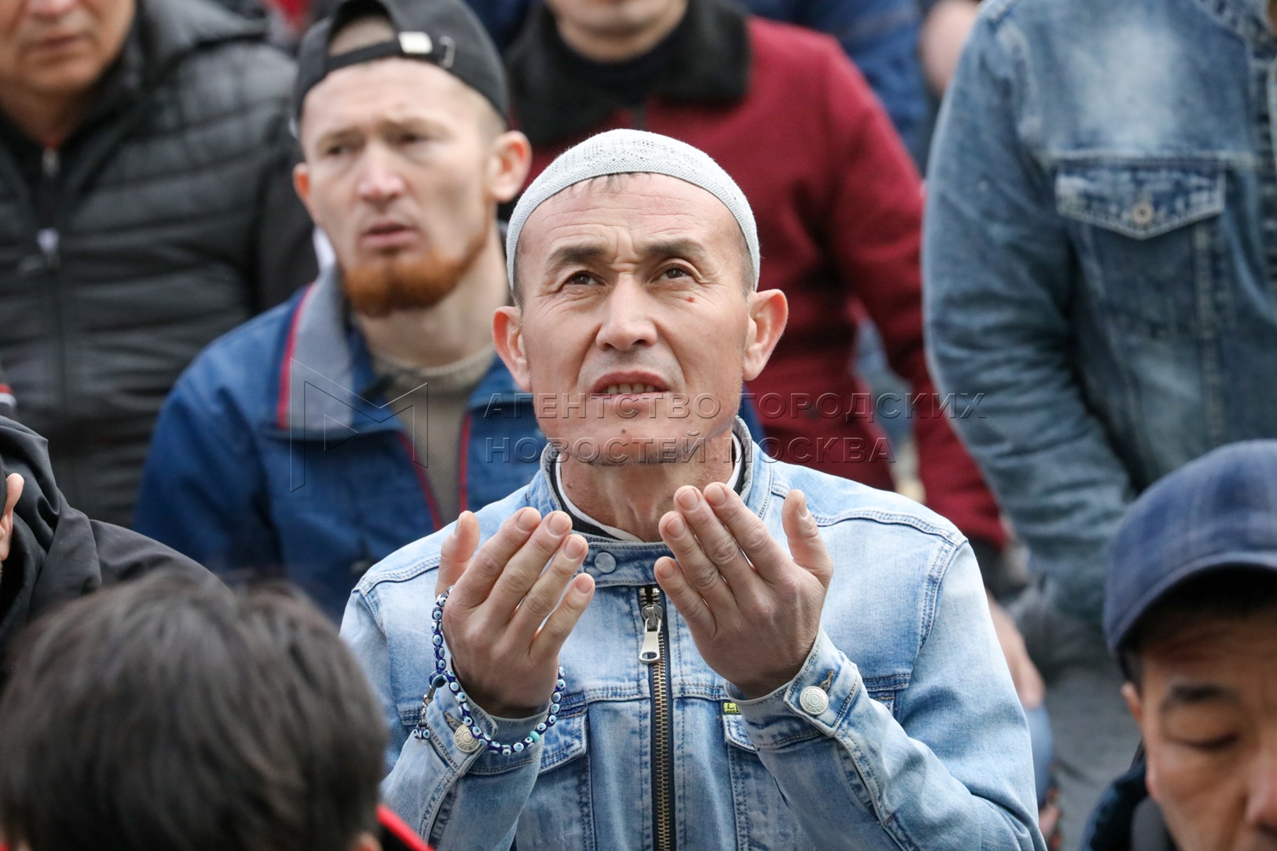 Мусульмане во время торжественного намаза по случаю праздника Ураза-байрам у Собо...