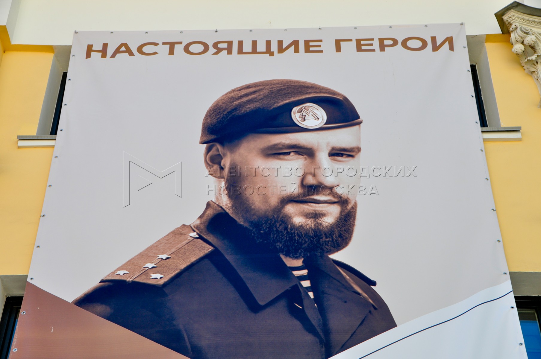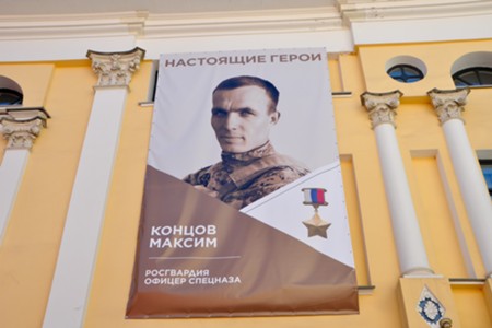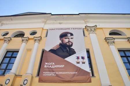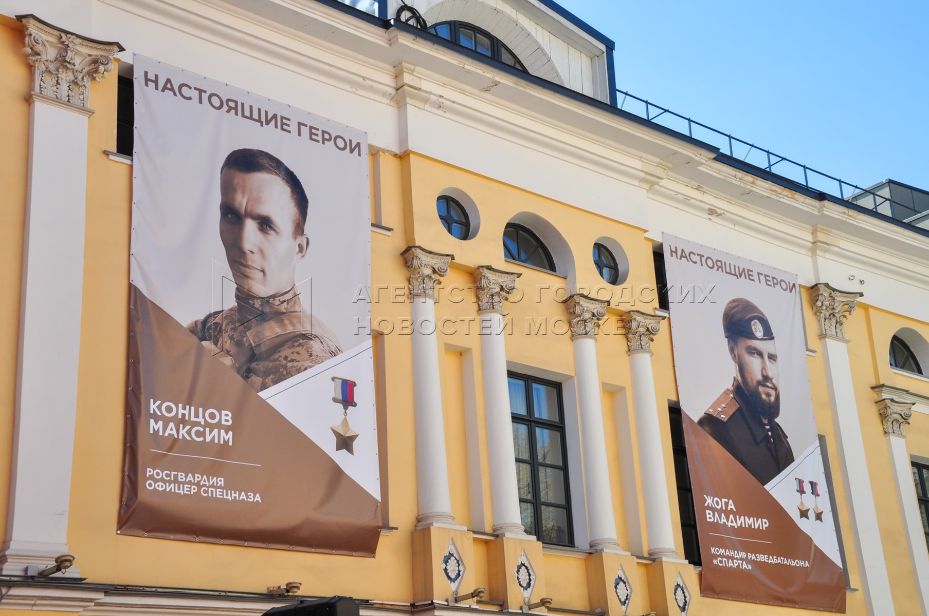 - Описание: Баннеры на фасаде штаб-квартиры Российского военно-исторического общества с портретами лейтенанта Росгвардии, Героя России Максима Концова и командира батальона «Спарта», Героя России и Героя Донецкой Народной Республики (ДНР) Владимира Жоги, погибших при выполнении служебно-боевых задач в ходе специальной военной операции.