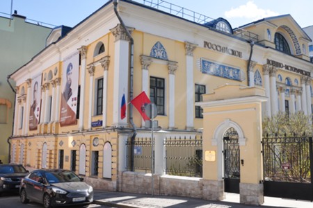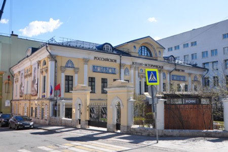 Баннеры на фасаде штаб-квартиры Российского военно-исторического общества с портретами лейтенанта Росгвардии, Героя России Максима Концова и командира батальона «Спарта», Героя России и Героя Донецкой Народной Республики (ДНР) Владимира Жоги, погибших при выполнении служебно-боевых задач в ходе специальной военной операции.