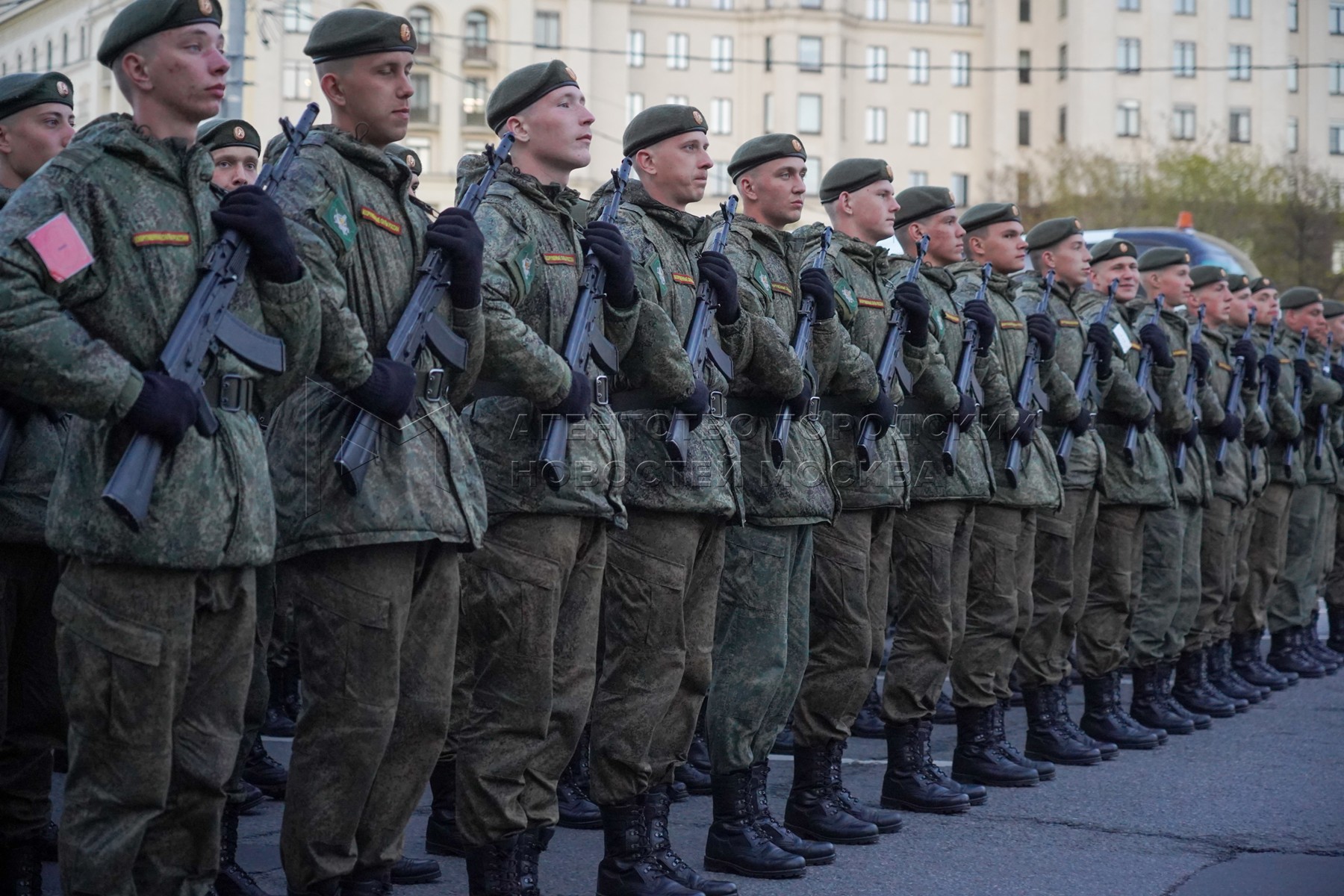 Военнослужащие во время репетиции парадных расчетов в Москве перед военным парадом, посвященным 77-й годовщине Победы в Великой Отечественной войне.