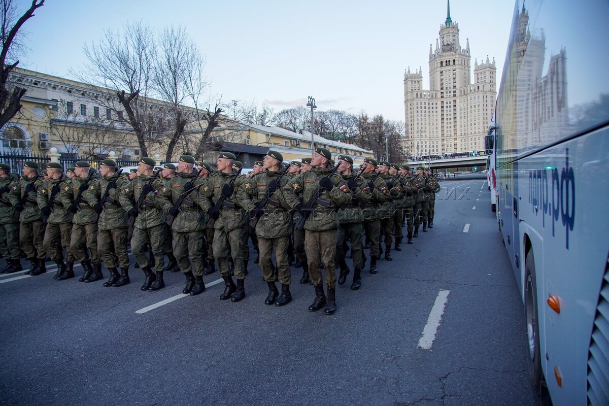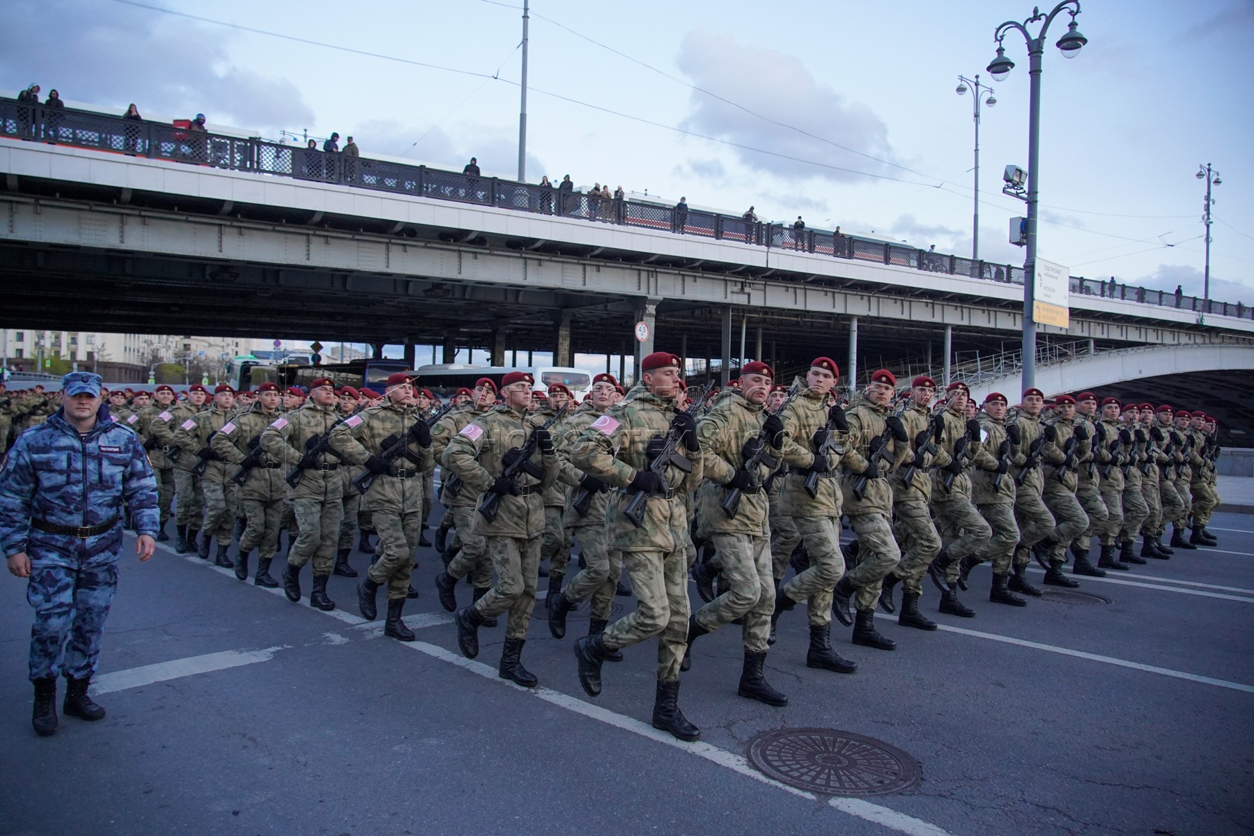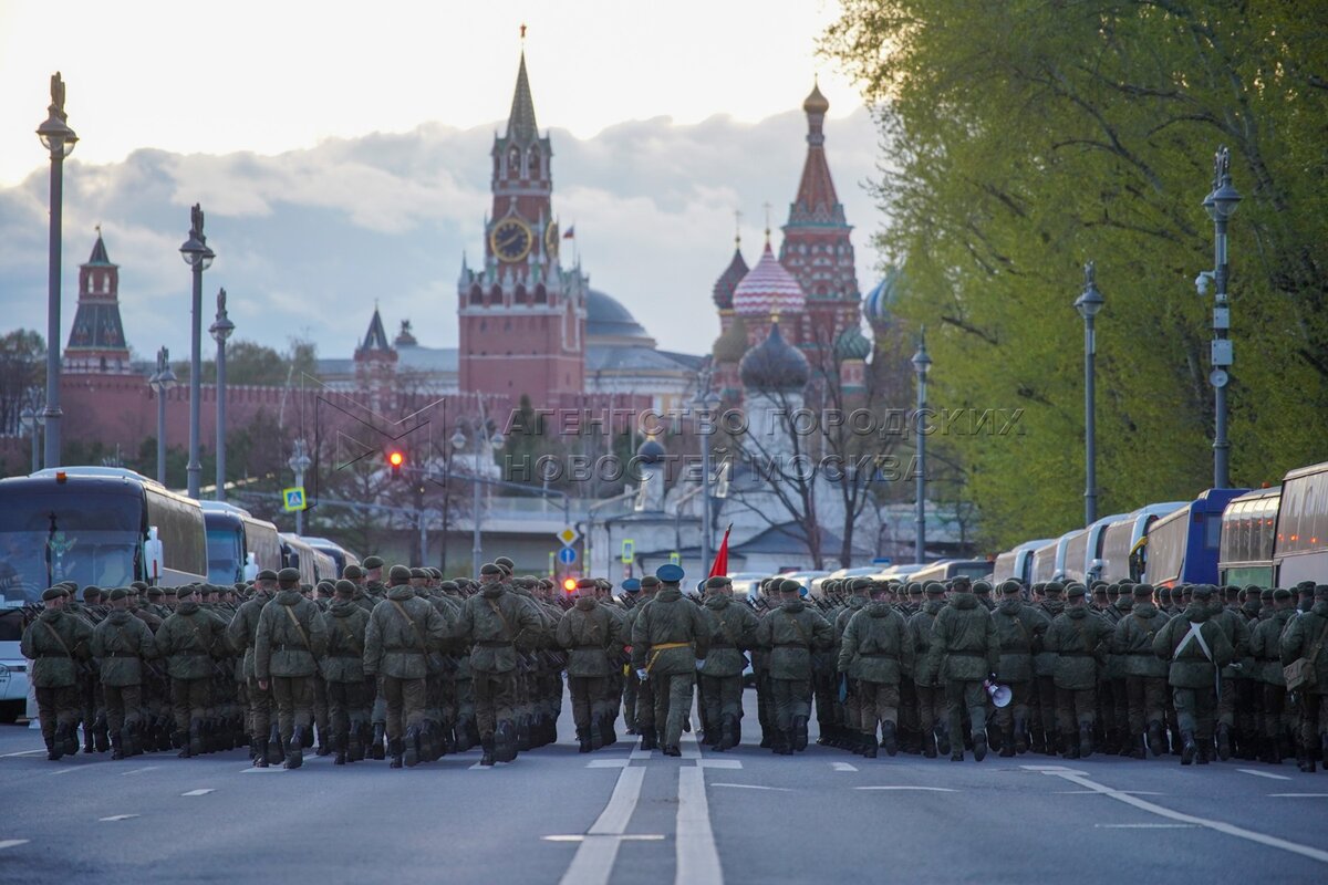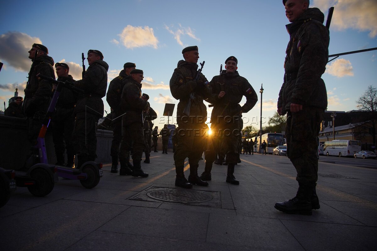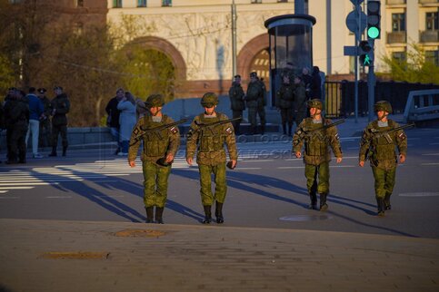 Военнослужащие во время репетиции парадных расчетов в Москве перед военным парадом, посвященным 77-й годовщине Победы в Великой Отечественной войне.