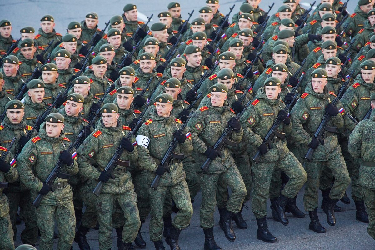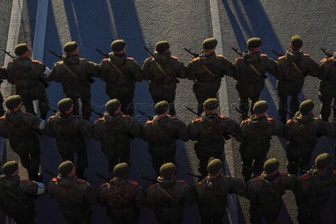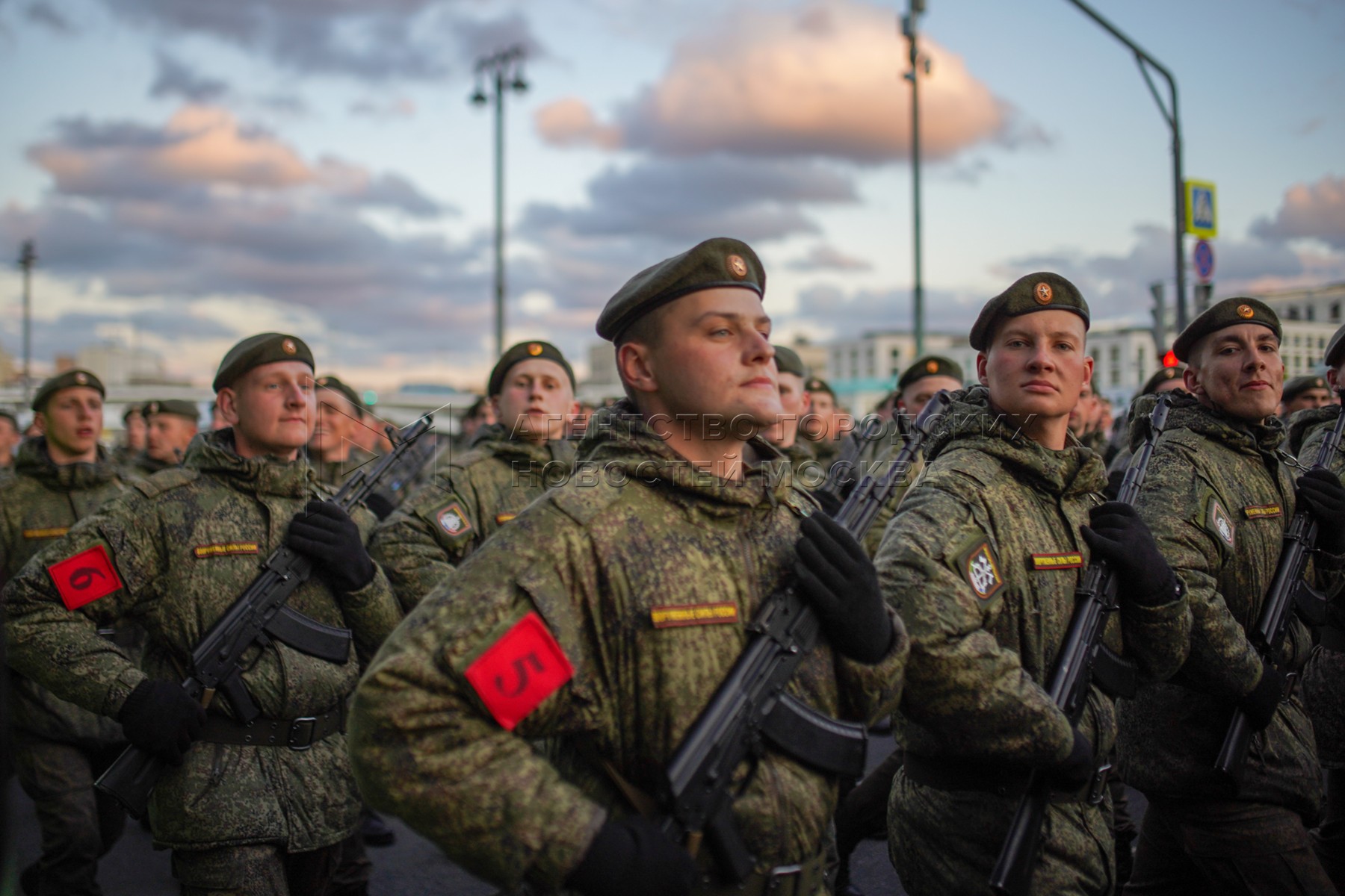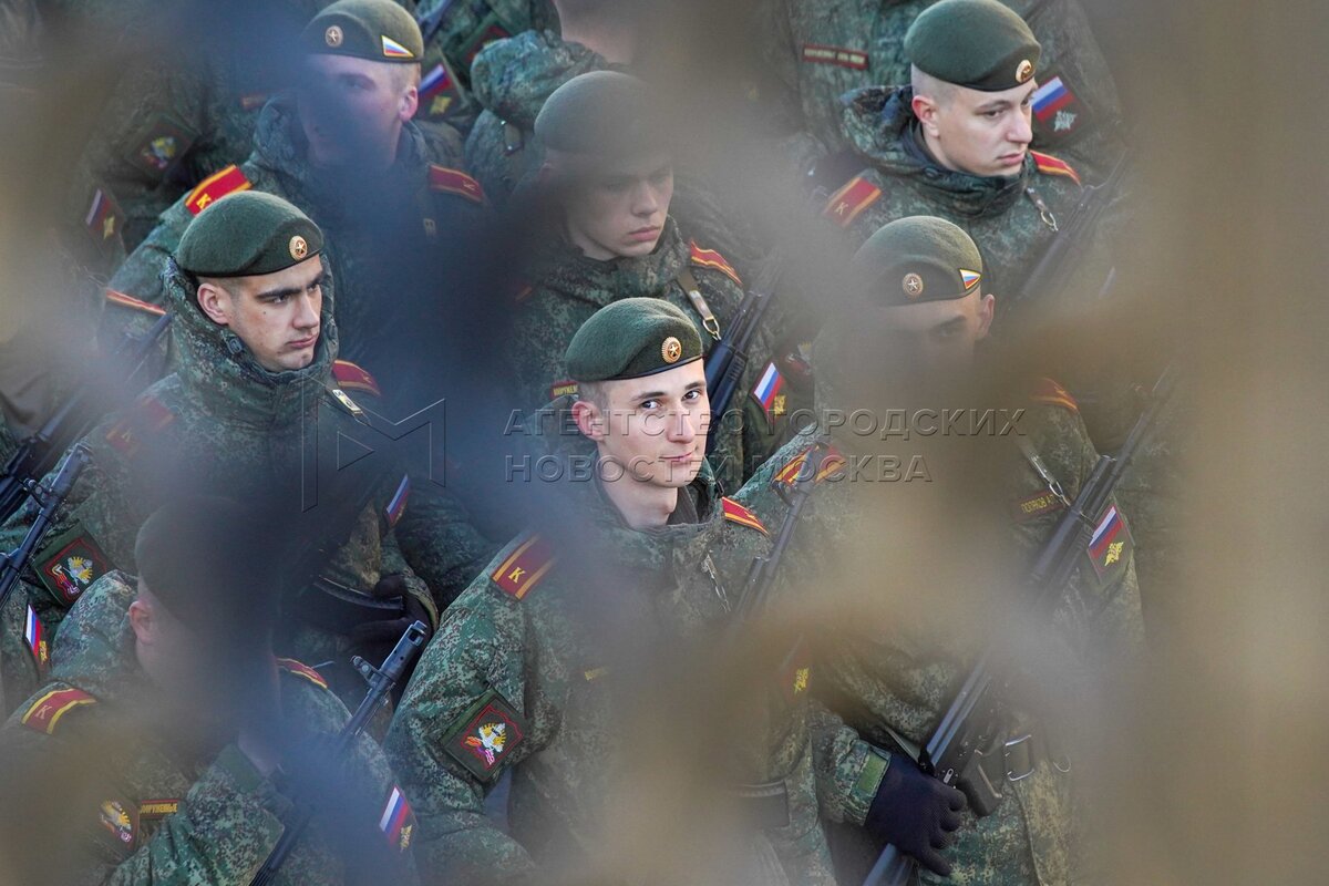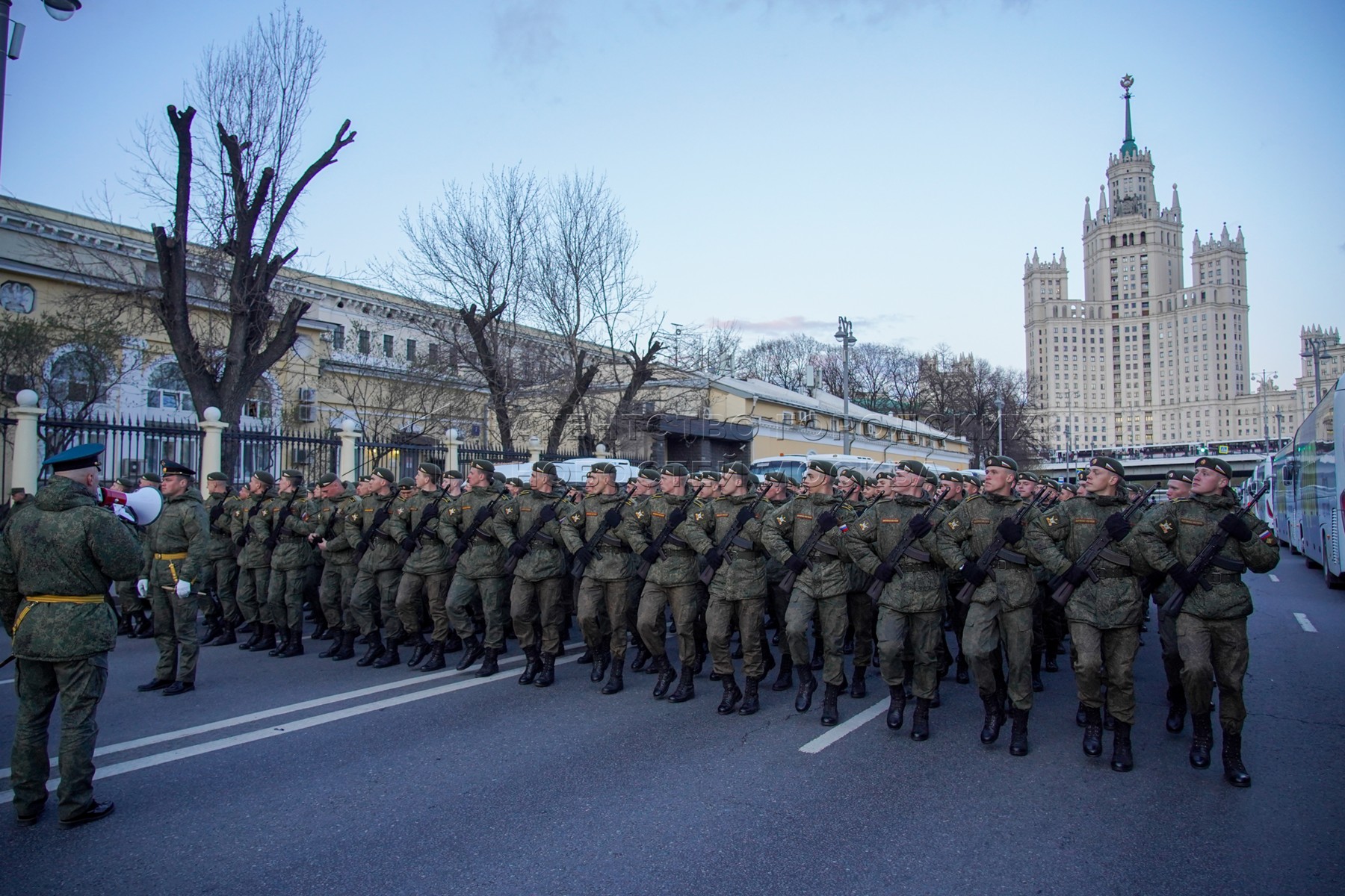 Военнослужащие во время репетиции парадных расчетов в Москве перед военным парадом, посвященным 77-й годовщине Победы в Великой Отечественной войне.