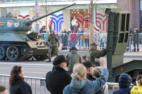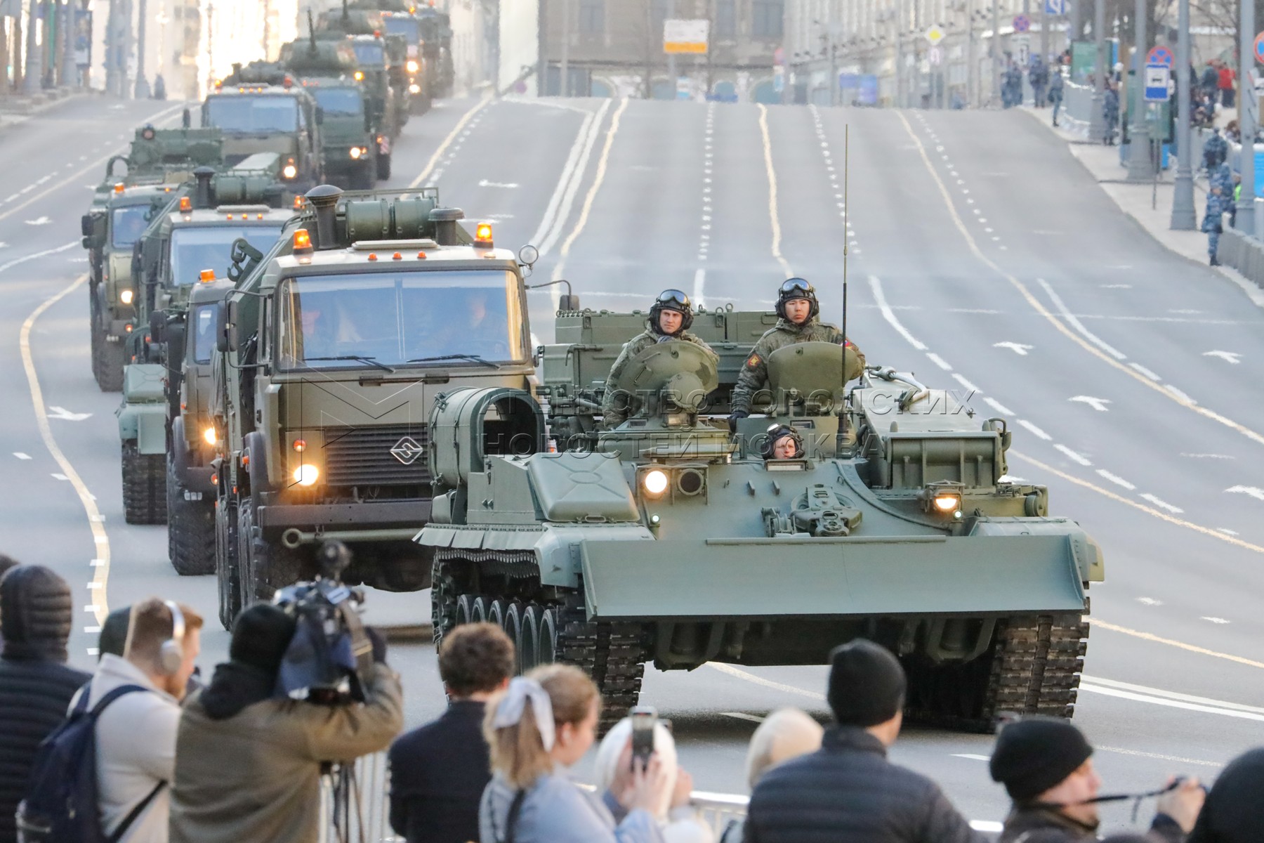 • Описание: Прохождение колонны военной техники перед ночной репетицией парада, посвященного 77-й годовщине Победы в Великой Отечественной войне.