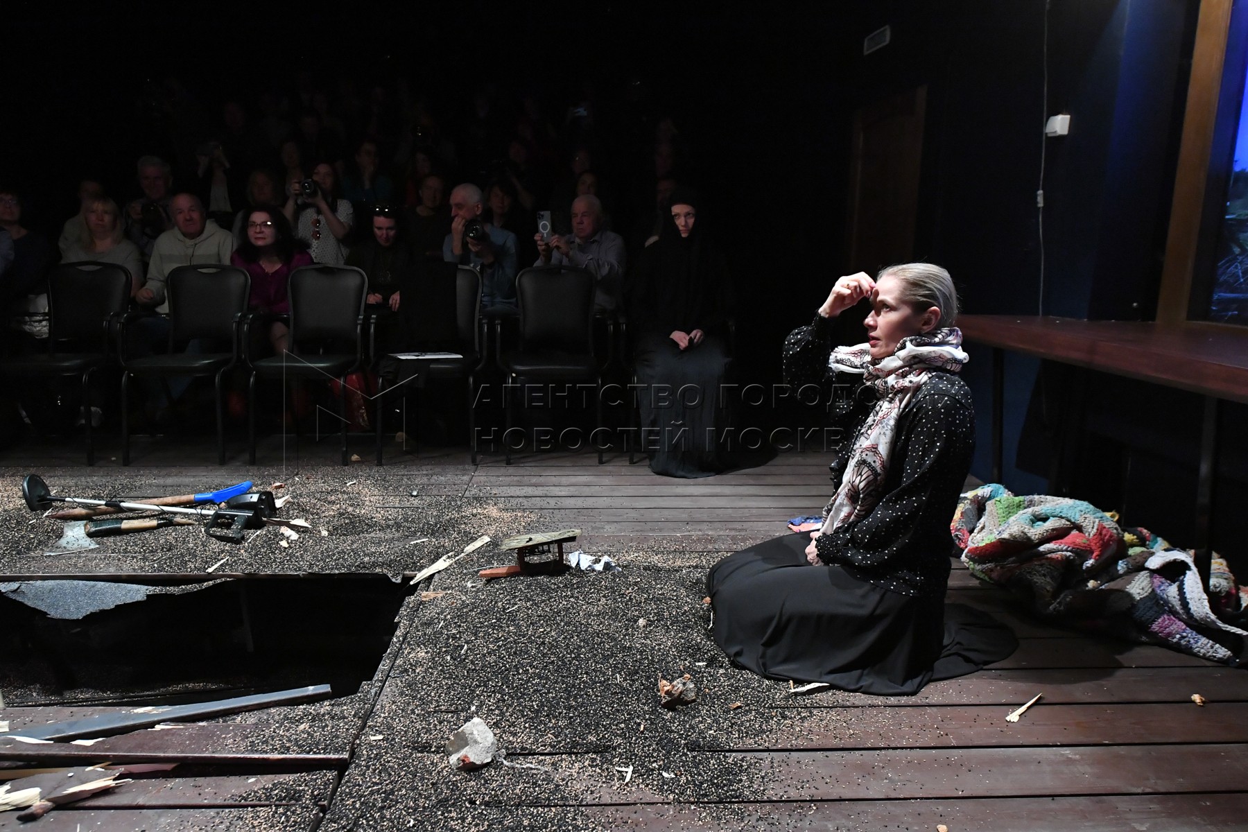 Актриса Мария Раевская в роли Паломницы во время показа спектакля «Ангелы вышли п...