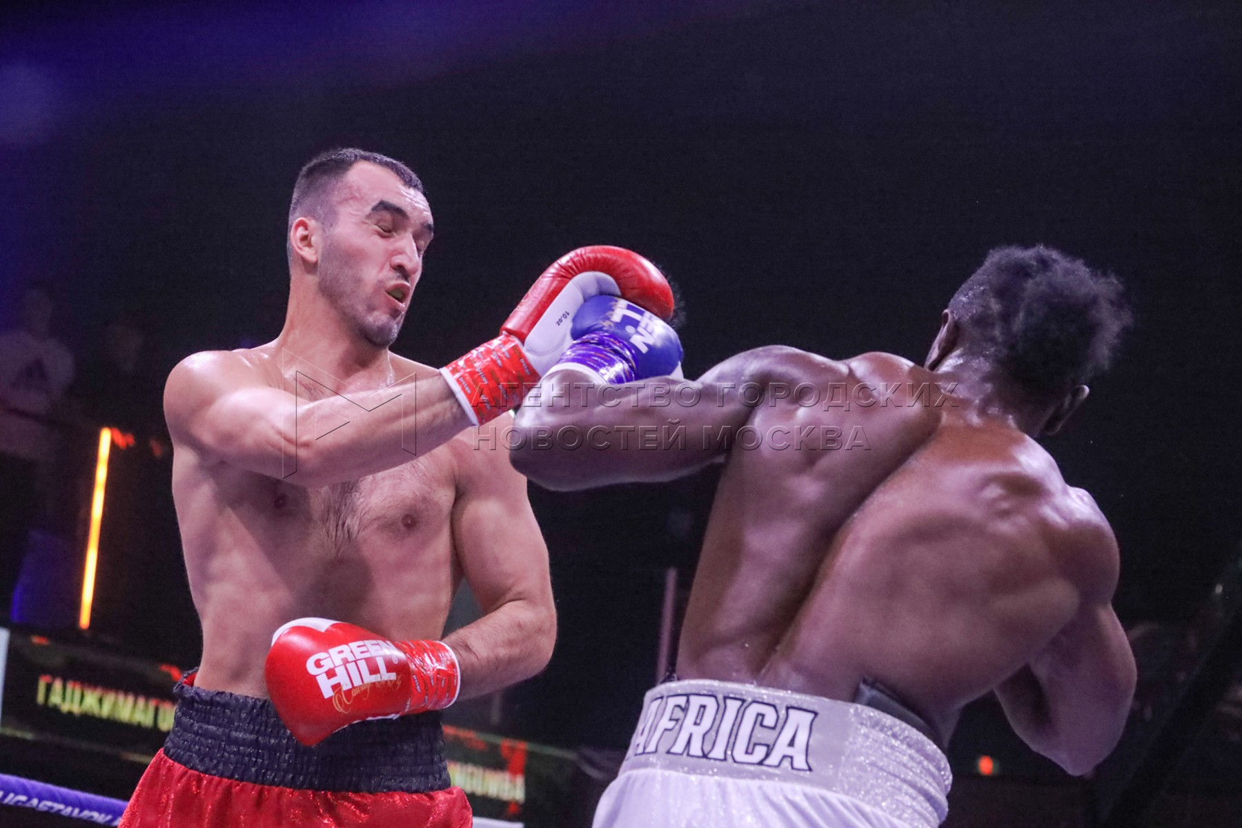 - Описание: Боксер сборной команды России Муслим Гаджимагомедов (слева) и боксер сборной команды Африки (Конго) Симба Кингумба во время поединка на третьем турнире по профессиональному боксу «Лига бокса. Интерконтинентальный кубок» на территории многофункционального event-пространства «Атмосфера».