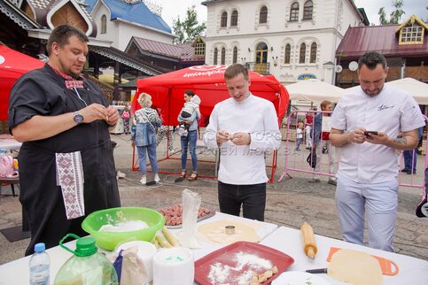 Шеф-повар Алексей Виноградов (слева) во время конкурса на самый вкусный пельмень ...