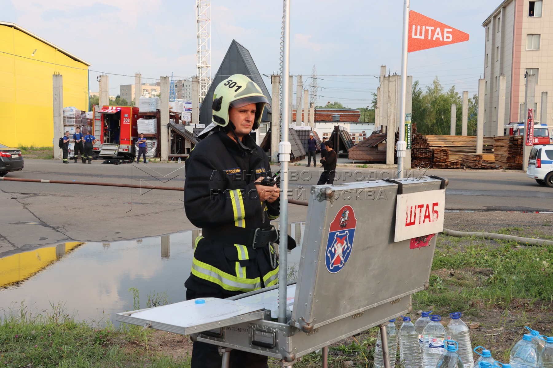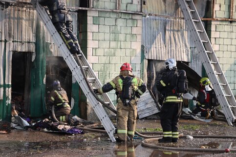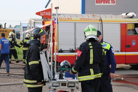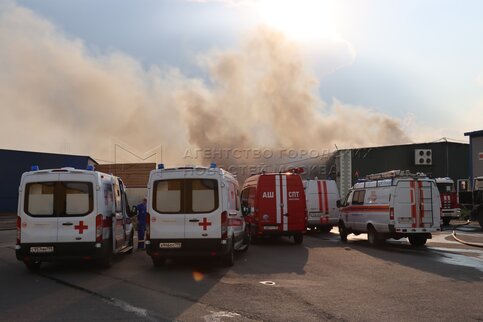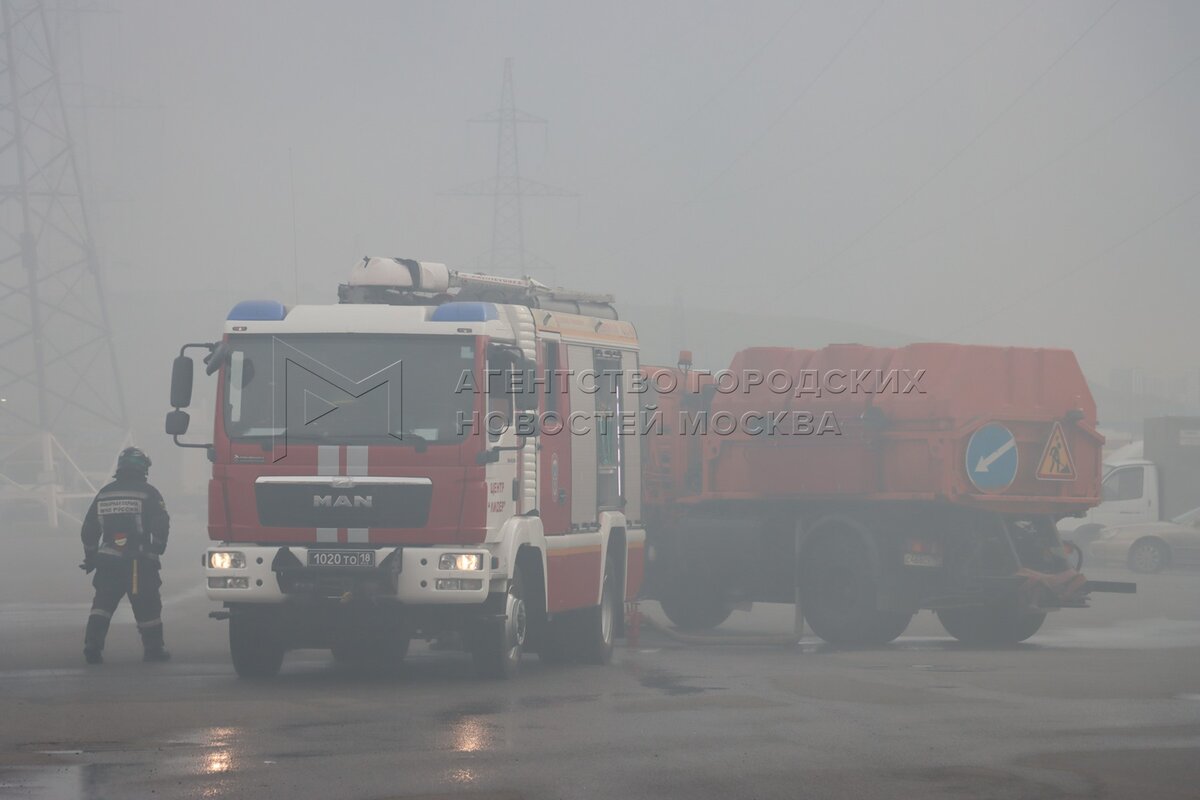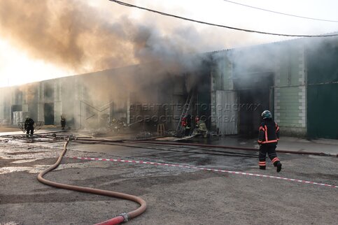 • Заголовок: Пожарные расчеты на месте возгорания в ангаре в ТиНАО