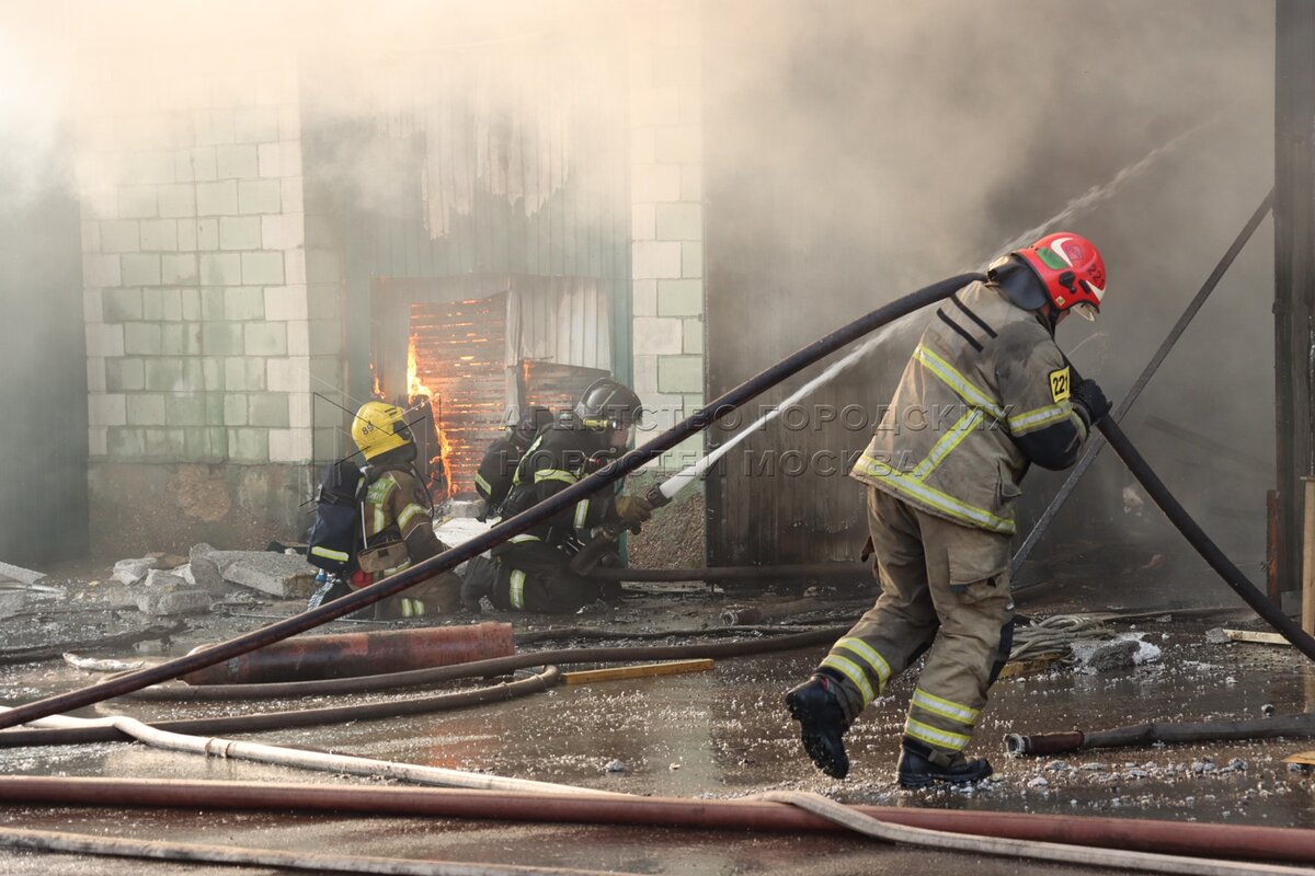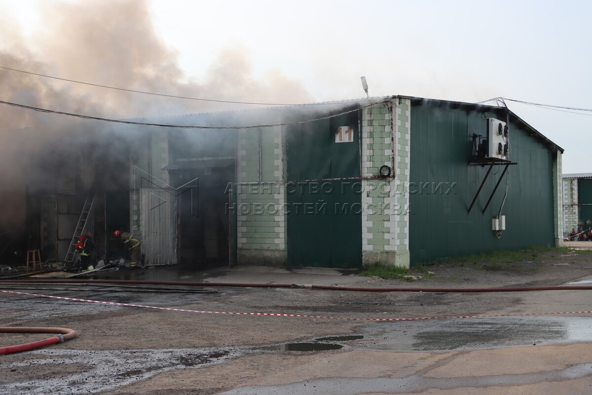 Пожарные расчеты на месте возгорания в ангаре на территории ТиНАО по адресу: пос. Мосрентген, корп. 11.