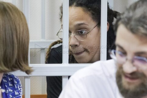 • Описание: Американская олимпийская чемпионка по баскетболу Бриттни Грайнер, обвиняемая в РФ в контрабанде наркотиков, во время заседания в Химкинском городском суде.