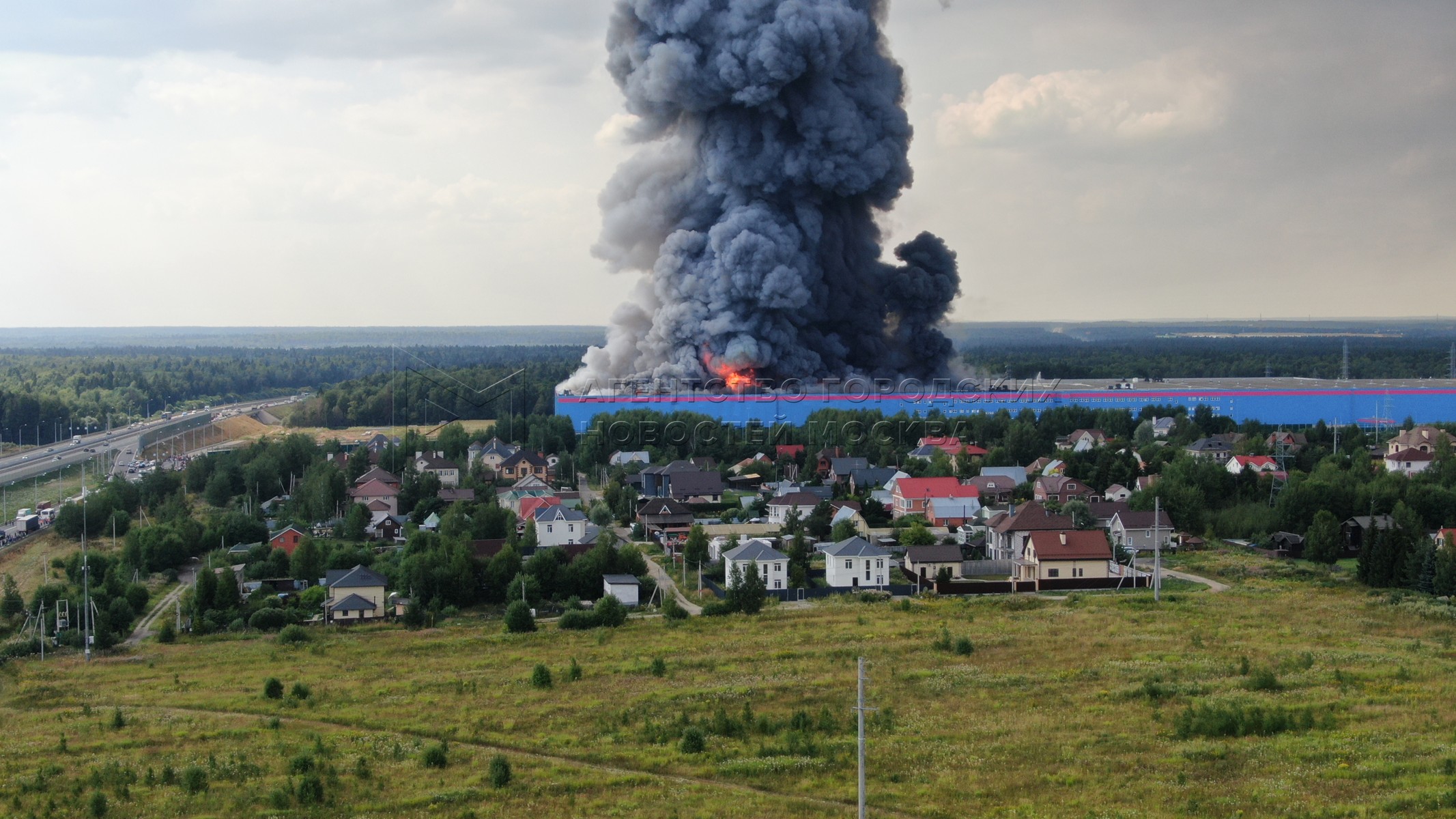 • Заголовок: Вид с квадрокоптера на пожар на складе Ozon в городском округе Истра