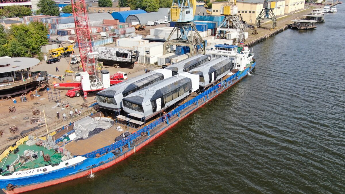 Вид с квадрокоптера на доставку в Южный порт Москвы первых четырех электрических речных трамваев.