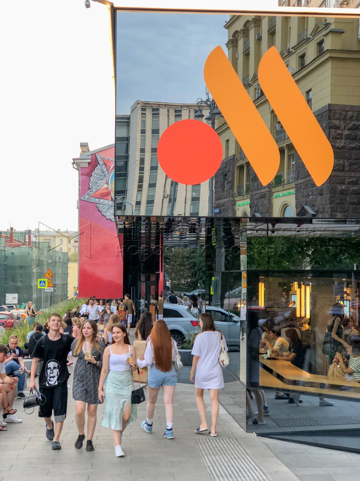 - Заголовок: Логотип «Вкусно - и точка» на флагманском ресторане быстрого питания на Пушкинской площади