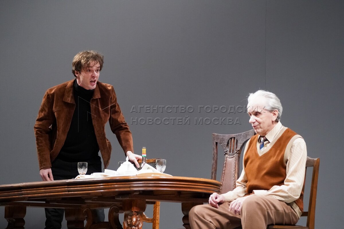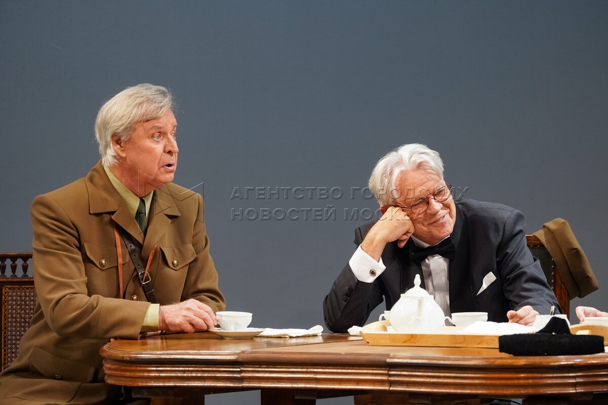 • Описание: Актеры Александр Голобородько в роли Инспектора Мича (слева) и Леонид Фомин в роли Хмелика во время показа премьерного спектакля «Соло для часов с боем» в Театре имени Моссовета.