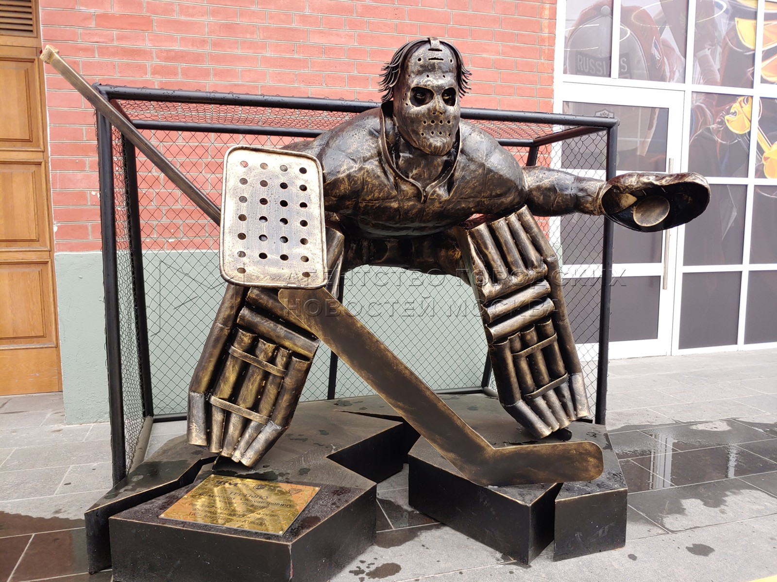 Скульптура заслуженного мастера спорта СССР, президента Федерации хоккея России Владислава Третьяка перед Музеем хоккейной славы.