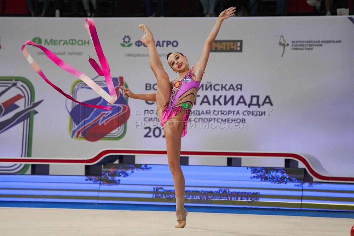 • Описание: Гимнастка Софья Агафонова во время финала соревнований по художественной гимнастике в рамках Всероссийской спартакиады сильнейших спортсменов 2022 года.