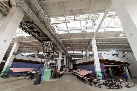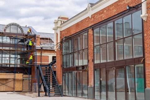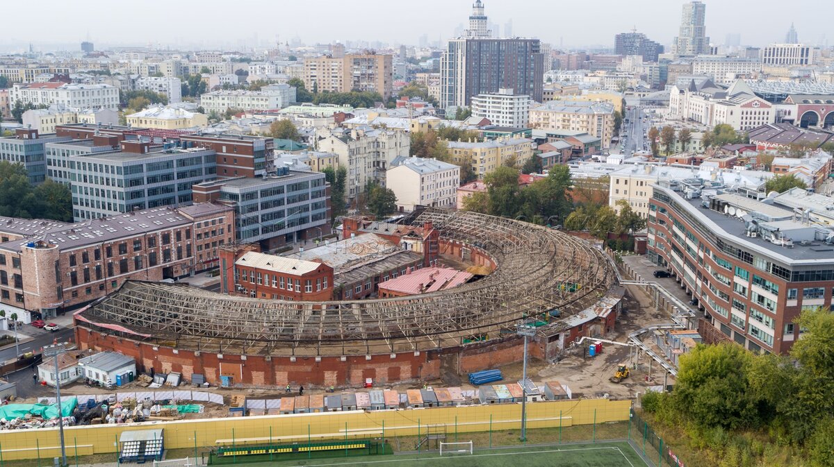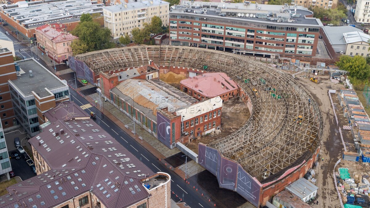 - Описание: Вид с квадрокоптера на ход строительства будущего гастрономического кластера «Депо. Три вокзала», который создается на территории бывшего трамвайного депо в районе Комсомольской площади. Фото: пресс-служба мэра и правительства столицы.