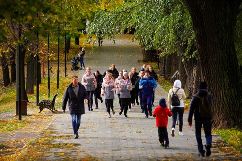 Осень в Москве. Горожане во время занятия скандинавской ходьбой в парке.
